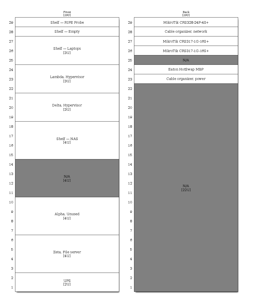 Most of my computer projects includes, or revolves around, my homelab — a 29U, 600x600 mm, rack in my home office.