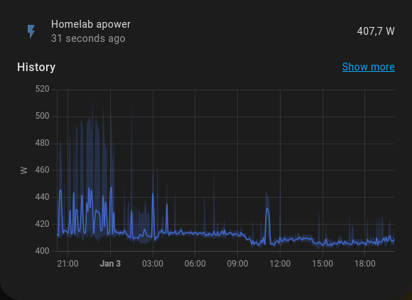 With the equipment I currently have powered on — the power is about 400-410 W. This includes all PoE devices, like Zigbee coordinator/router, Wi-Fi access points and CCTV cameras.