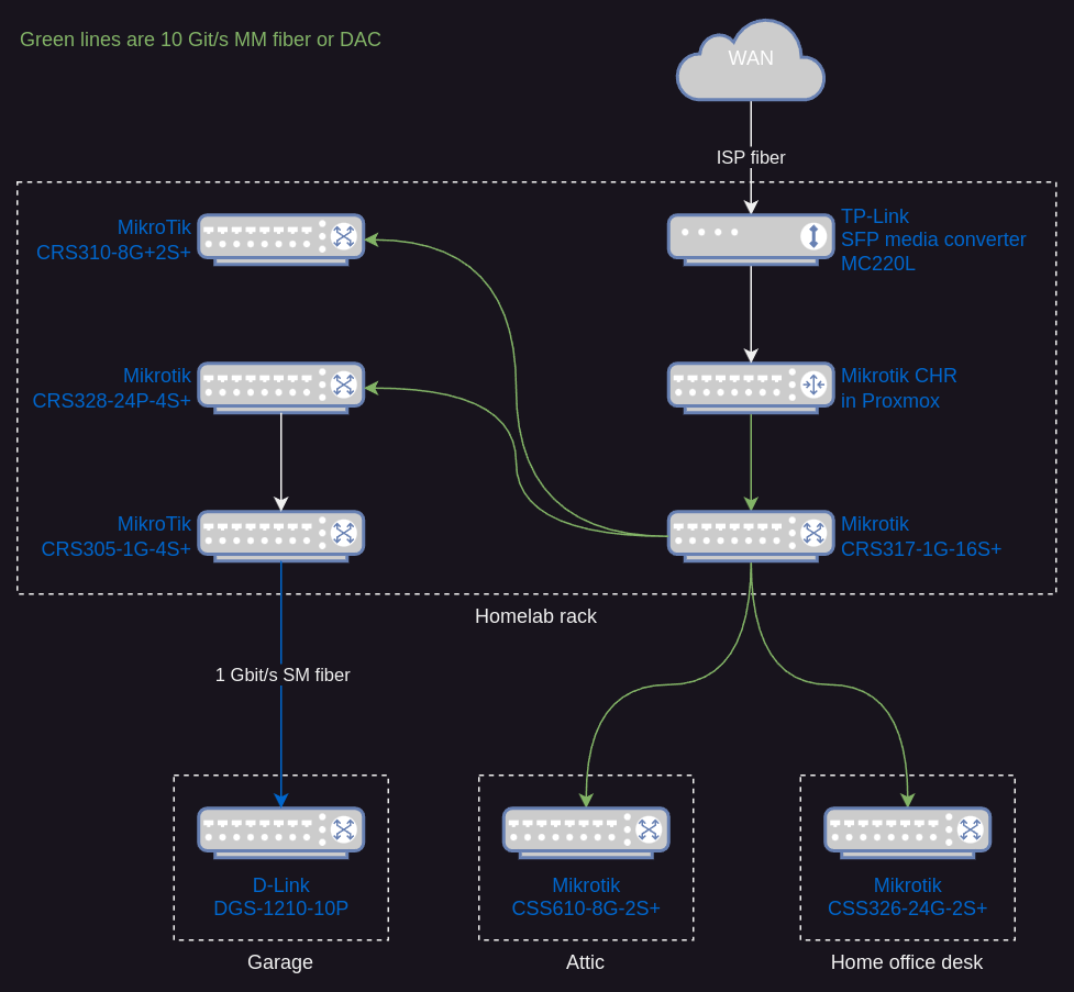 The MikroTik switches have 40 mm fans, but they run on low RPM and doesn’t spin up. With one exception; if I put a 10 Gbit/s copper SFP+ module in CRS317-1G-16S+ — the fans start ramping up and it becomes loud. But I don’t use 10 Gbit/s copper, so that isn’t a problem for me.