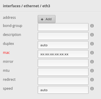 Then we go into the Config Tree -> interfaces/ethernet/eth3 and set the MAC address. This must be the MAC address on the Altibox router/home central: