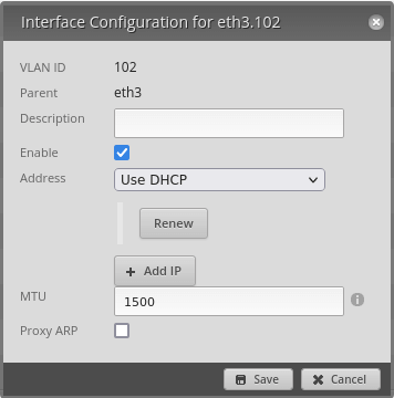 First we create a new VLAN 102 on eth3, set IP address to Use DHCP: