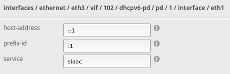 Next I added the eth1 interface, my LAN, and set host-address to ::1, prefix-id to :1, and service to slaac.