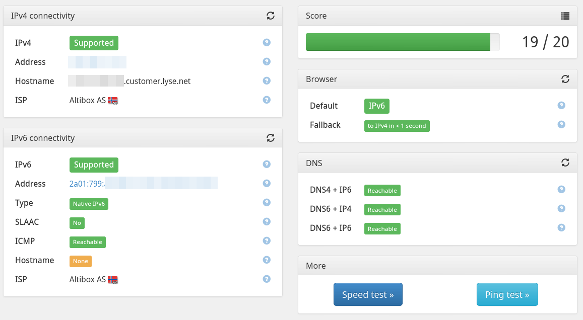 Altibox offers native dual-stack IPv6 if your home central is in bridge mode. You get a /56 prefix though DHCPv6-PD (prefix delegation) and can split it into multiple /64 networks. (β¦) β sveinse