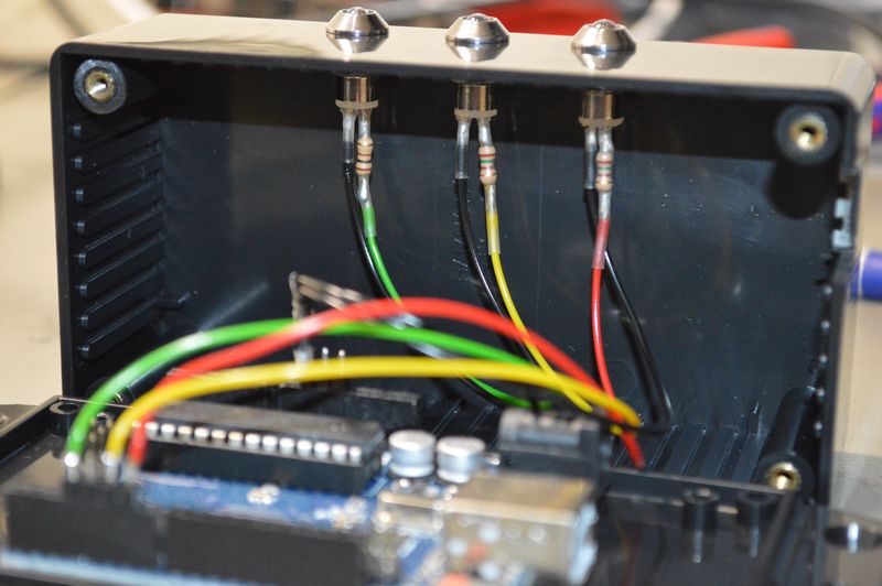 I used three LEDs, but you can use an RGB LED instead. Each LED has a resistor in series, the size of this resistor depends on the LED. I used 100 and 150 ohms. The outputs on the Arduino has a maximum current of 40 mA, now that is the absolute maximum, so it’s best to stay a bit lower than that. A typical LED is 20 mA, so that is no problem. However, if you want to drive bigger, more powerful LEDs, you need a transistor between your Arduino and LED. Another thing to keep in mind is that the total current on all output pins must not exceed 200mA, but not a problem for our three 20mA LEDs.