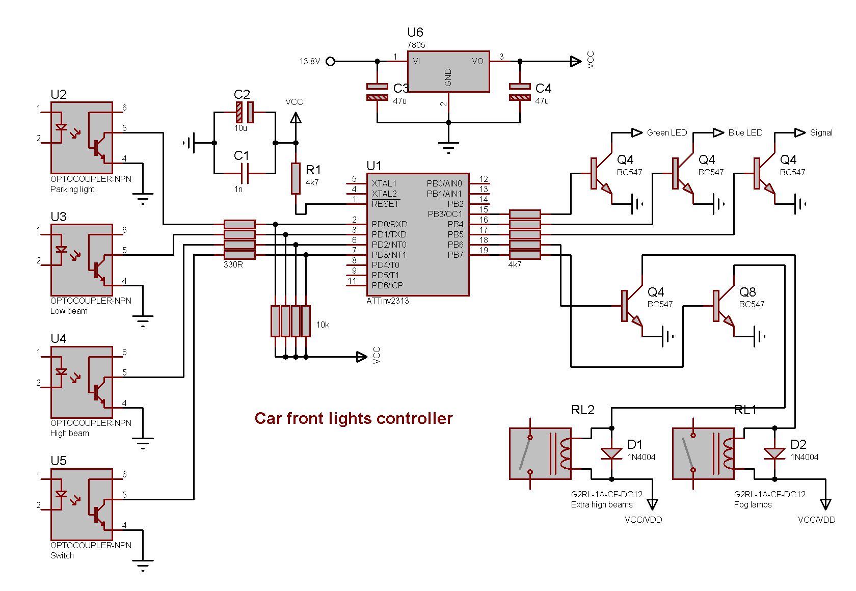 Lights controller for high beams and fog lights on my Subaru. Uses an AVR ATtiny2313 microcontroller.