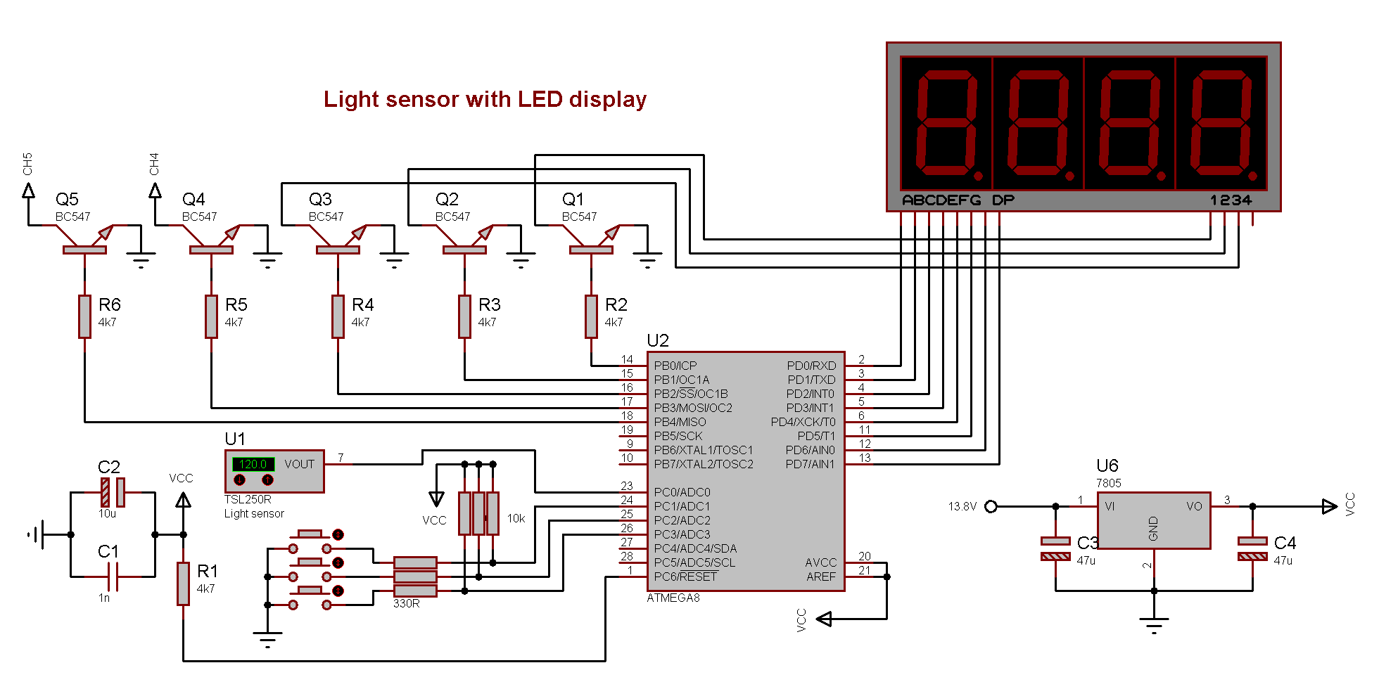 Measures light intensity and shows the value on a LED display, if value passes over/under the set point the output is enabled. Uses the AVR ATmega8 microcontroller.