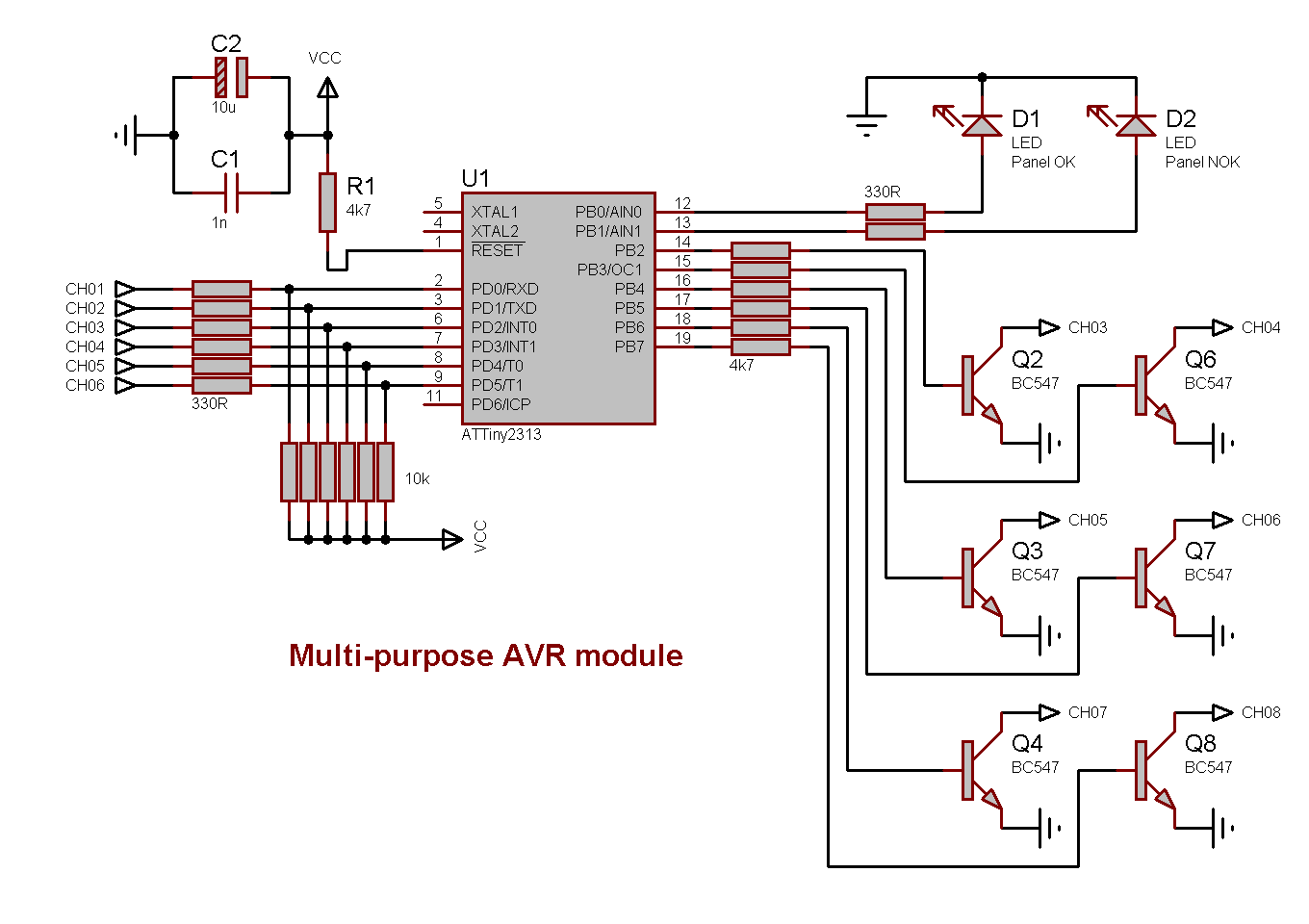 - 1 × AVR ATtiny2313-20PU, DIL-20, 20 MHz, 18 I/Os