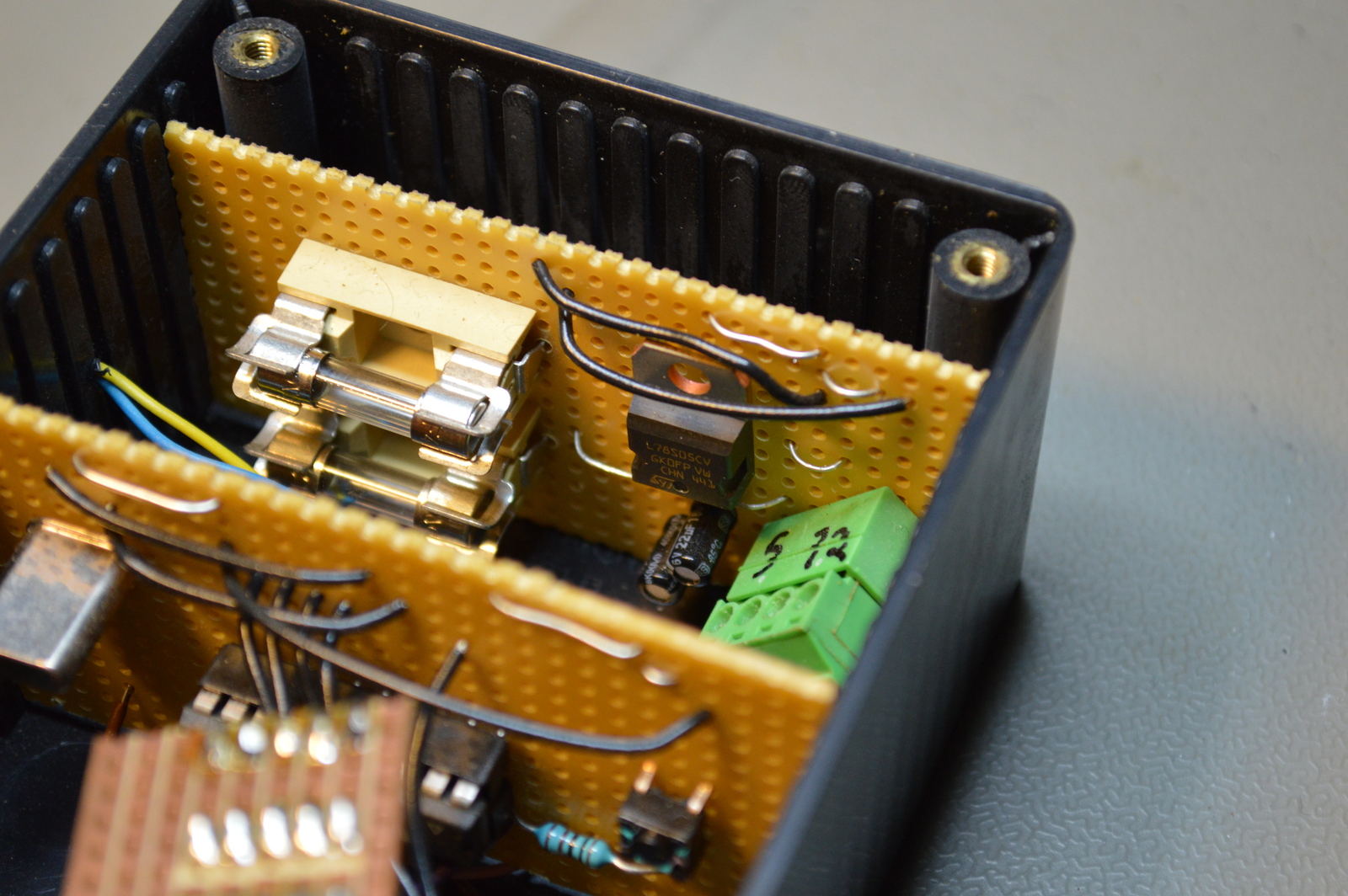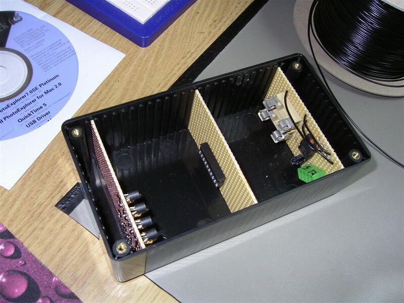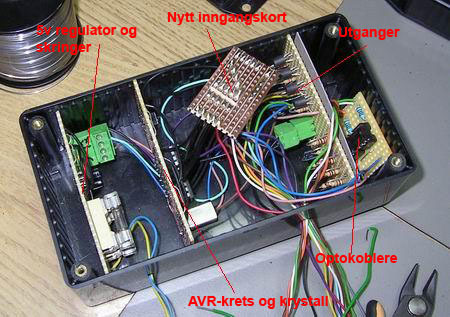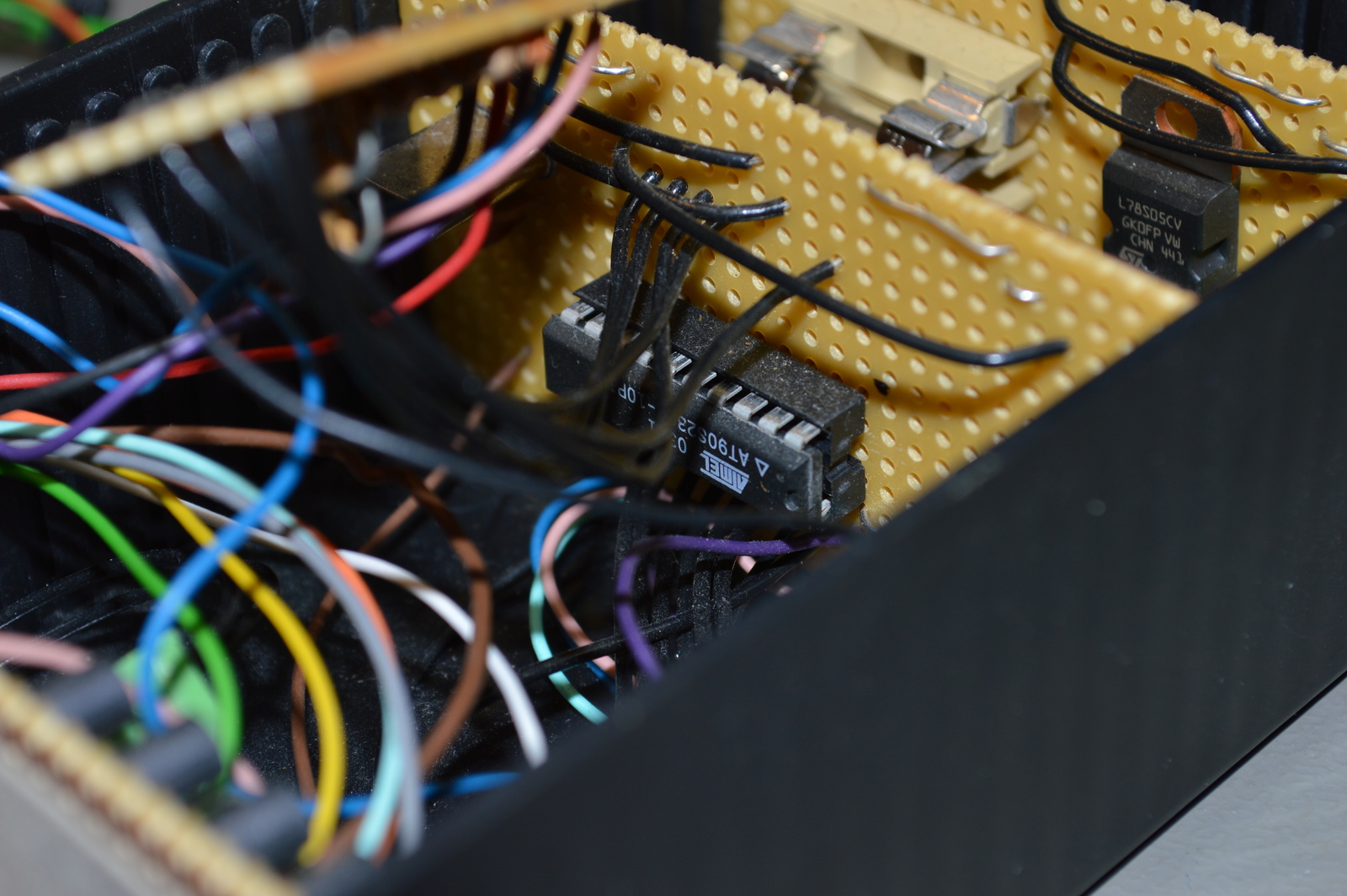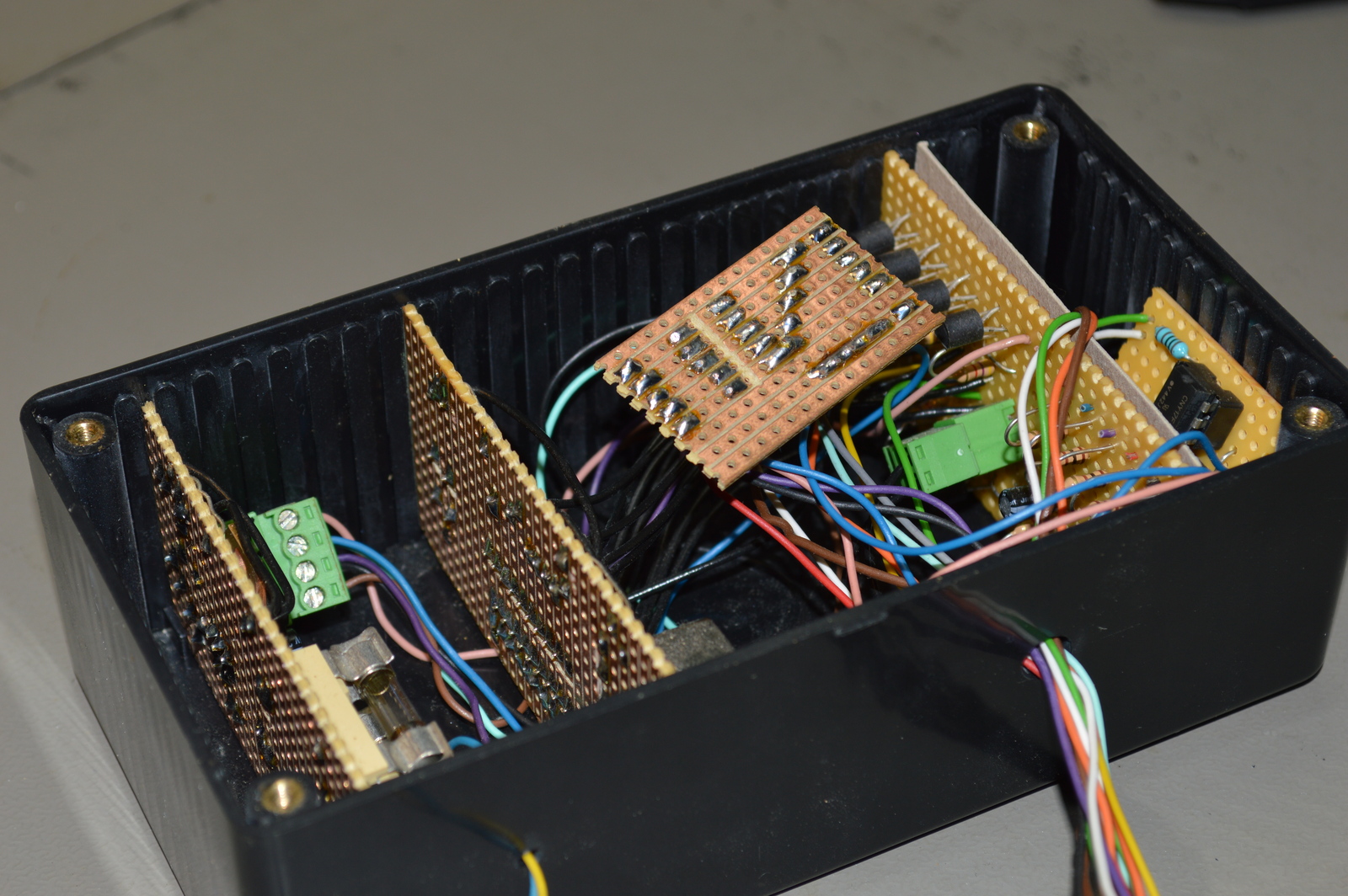 This being the my very first AVR microcontroller project, it took a bit of time to get it to work and I made some schematic mistakes. That’s why you can see a few extra strip boards stuffed into the box in the images, I used the wrong resistor values for all the inputs and had to redo those. That was also when I added the optocouplers.