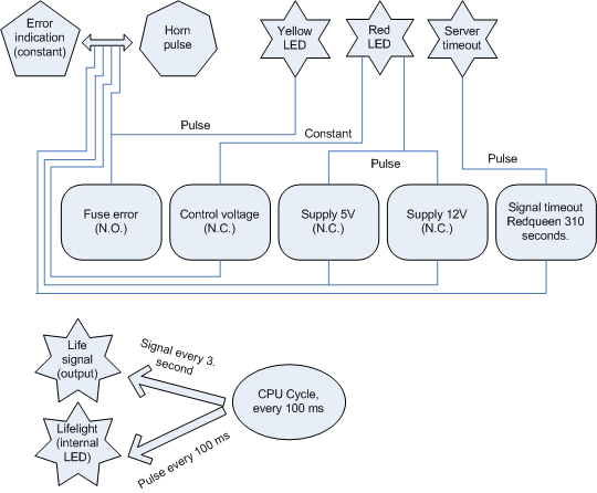 To make sure my Linux server was present, responding and the I/O module was OK; a heartbeat signal was sent every 60 seconds. If this signal went silent for over 310 seconds, meaning 5 minutes and a bit, the server was regarded as timed-out and the alarm triggered.