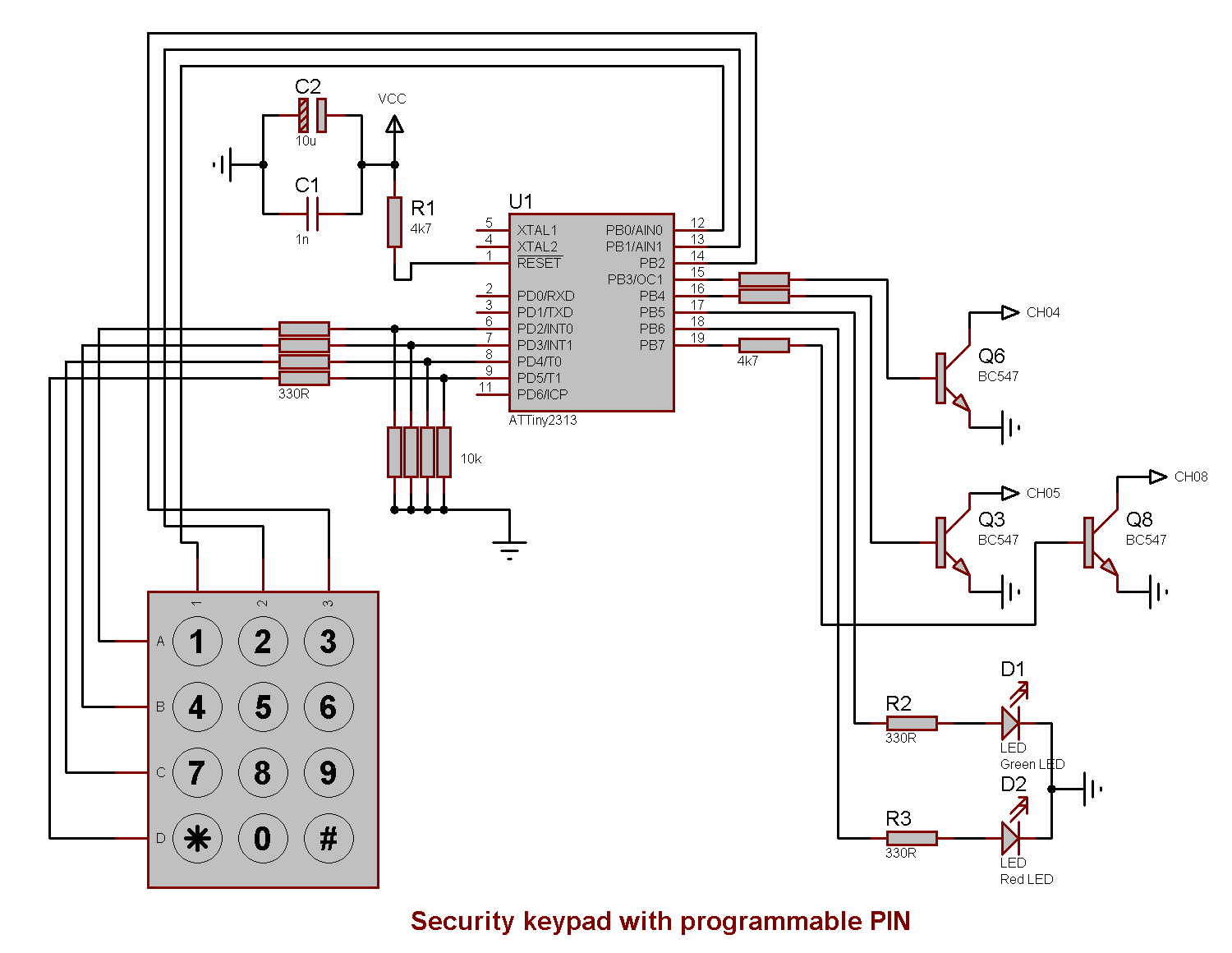 Keypad with programmable PIN code, two outputs (modes) and protection against repeated incorrect PINs. Uses an AVR ATtiny2313 microcontroller.