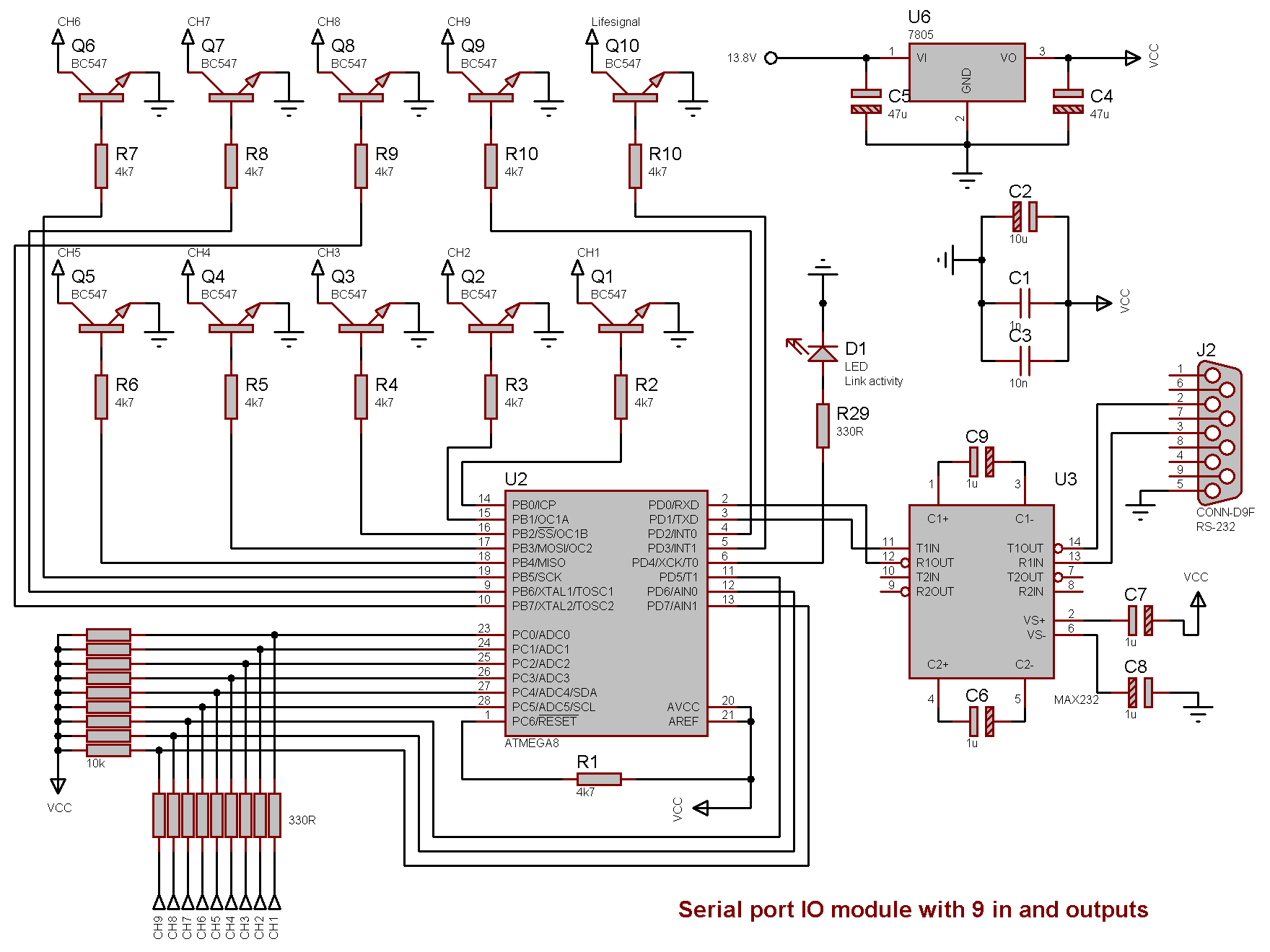 - Serial port I/O module with 9 in and outputs — AVR