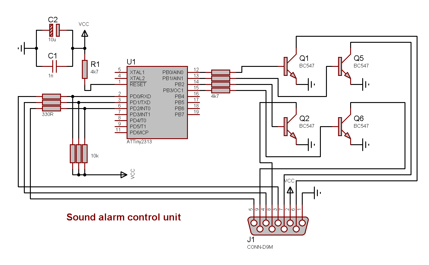 Simple unit to control three sound signals; beep, siren and buzzer. Uses an AVR ATtiny2313 microcontroller.
