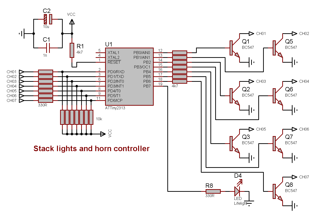 A control module for a green, yellow and red stack light, and signalling horn. Uses an AVR ATtiny2313 microcontroller.