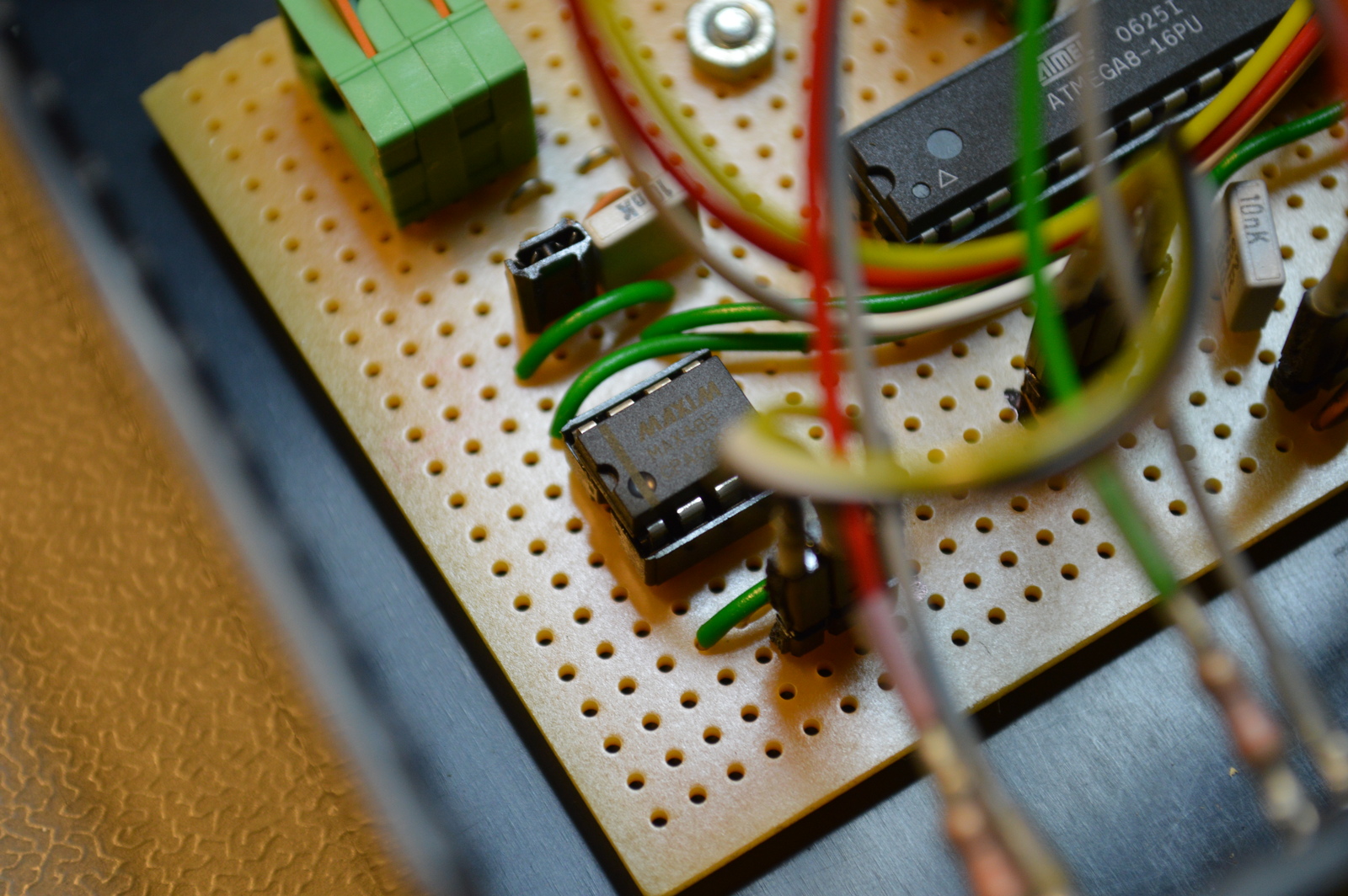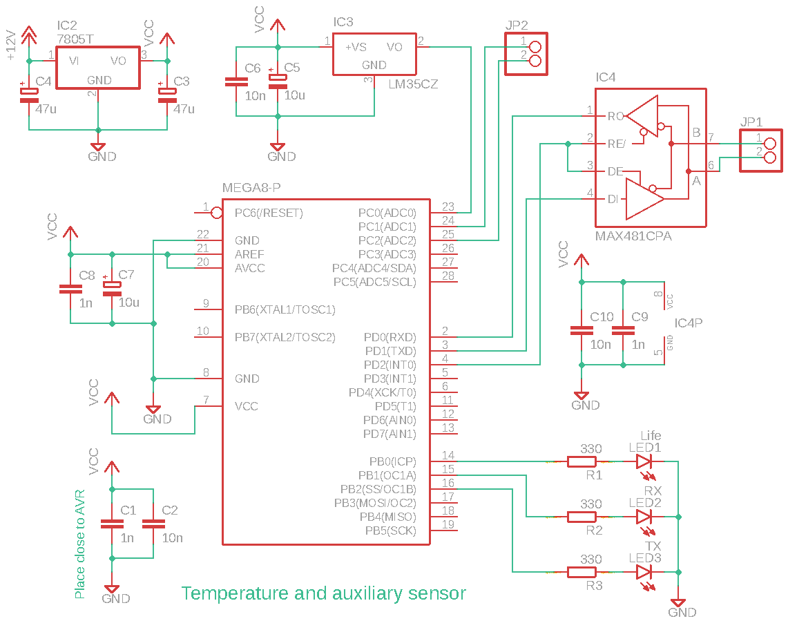 Temperature sensor with serial RS-485 interface. Two additional sensors can be connected using 3-pin headers on the circuit board. Uses an AVR ATmega8 microcontroller.