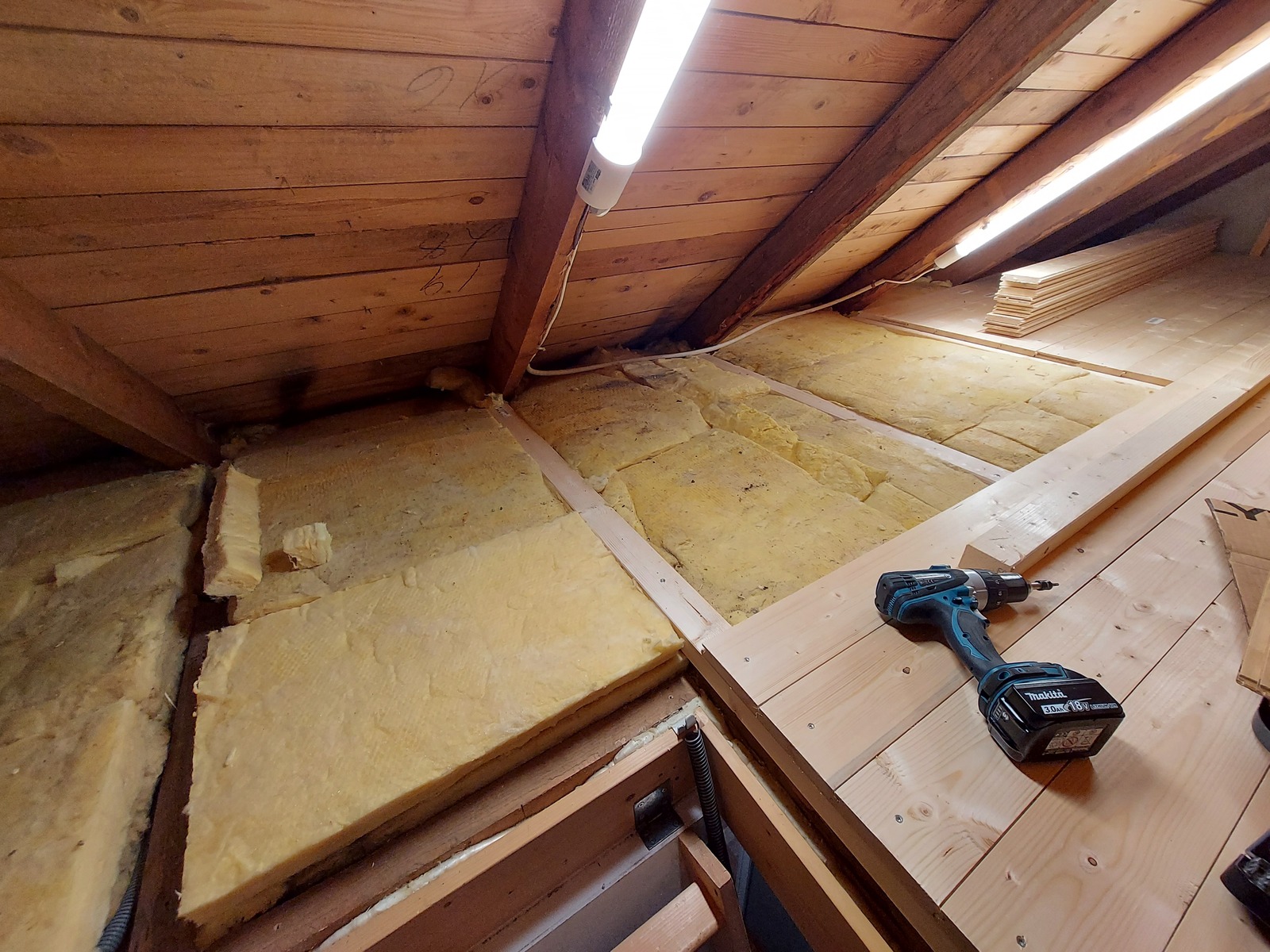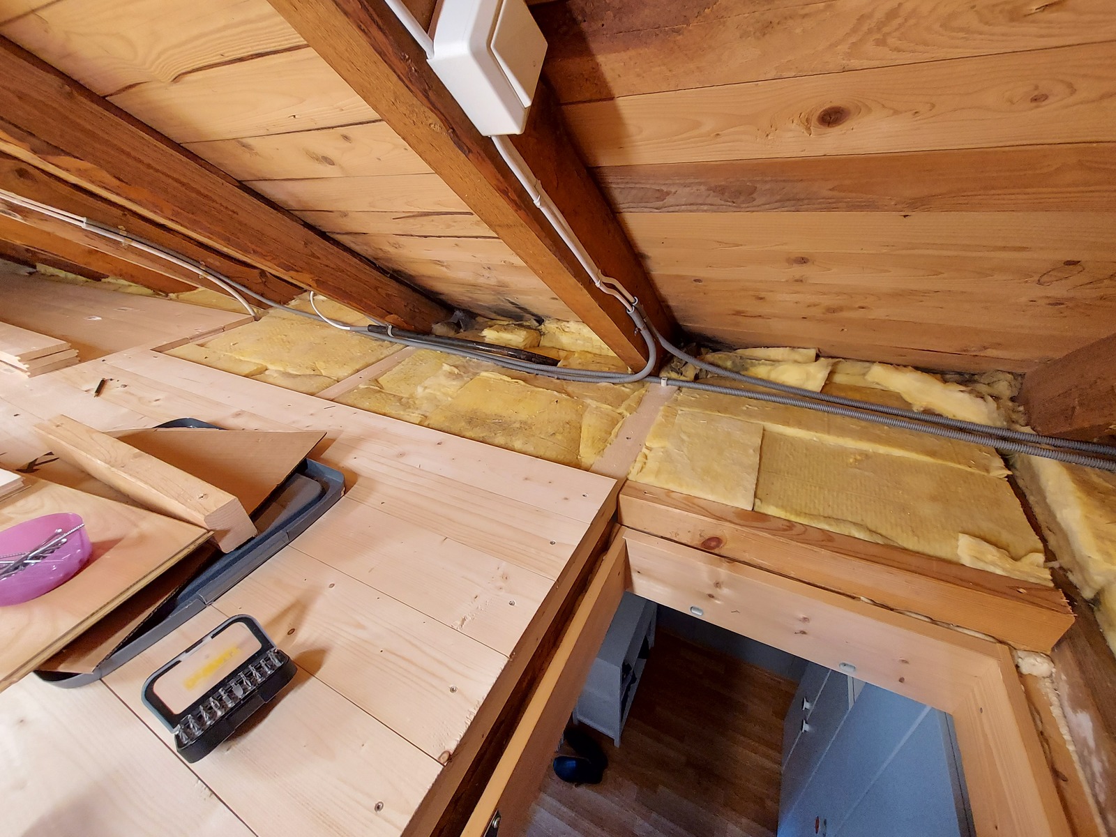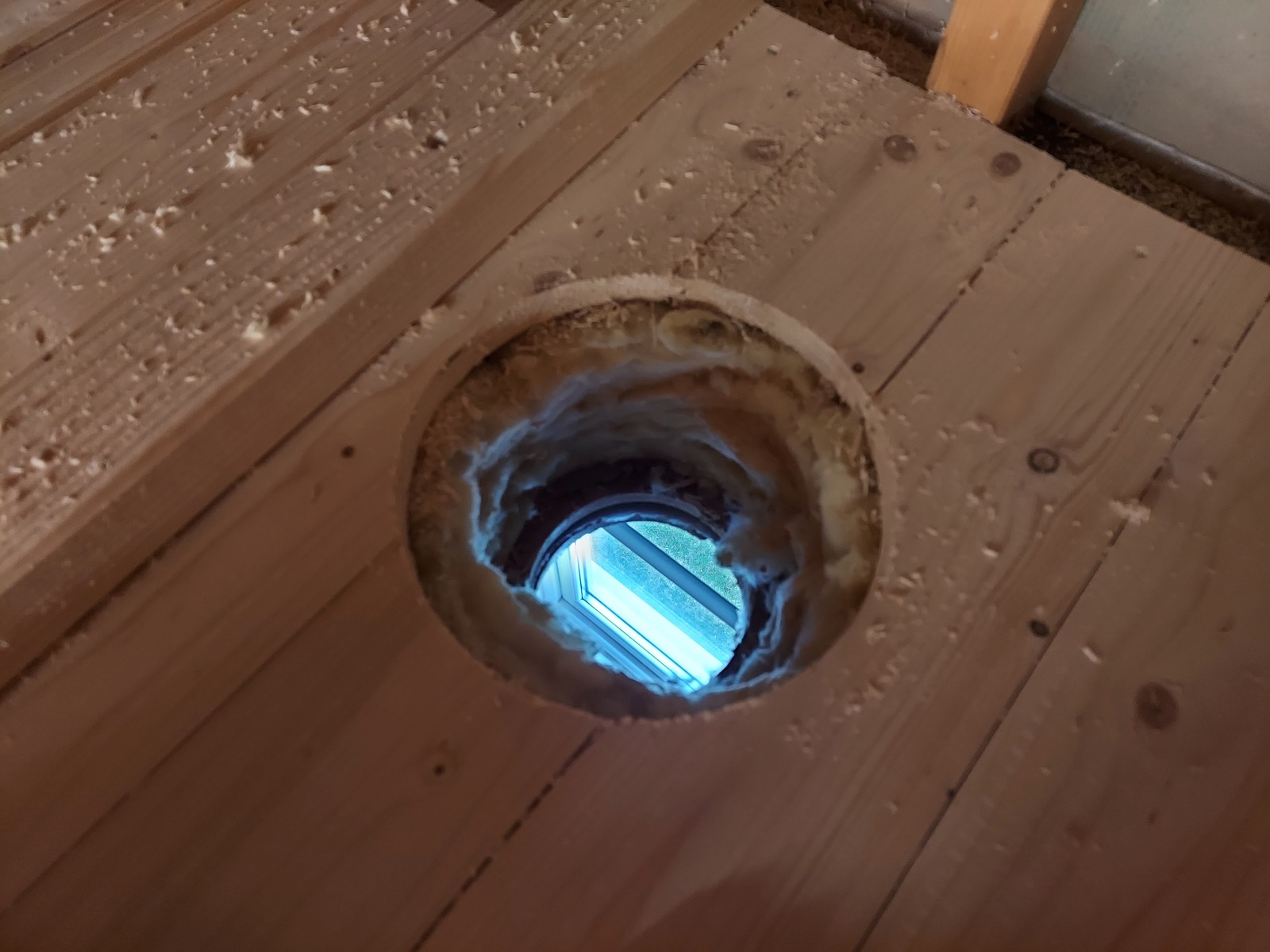 The hole drilling continues! This one going through the attic flooring, and into one of the kids’ rooms.