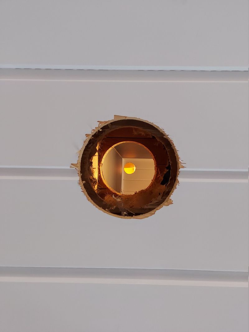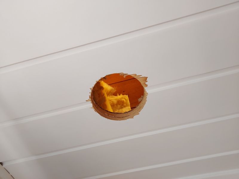 The bathroom already had an opening, where the exhaust fan used to be. The cable and screw holes are visible.