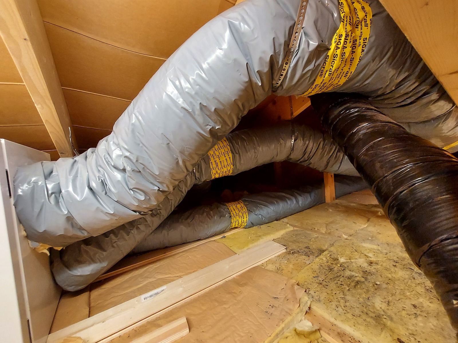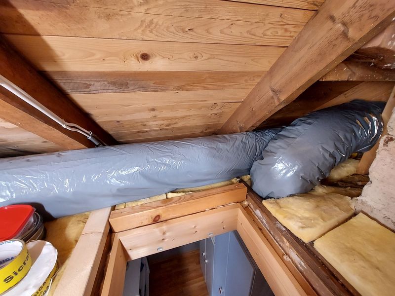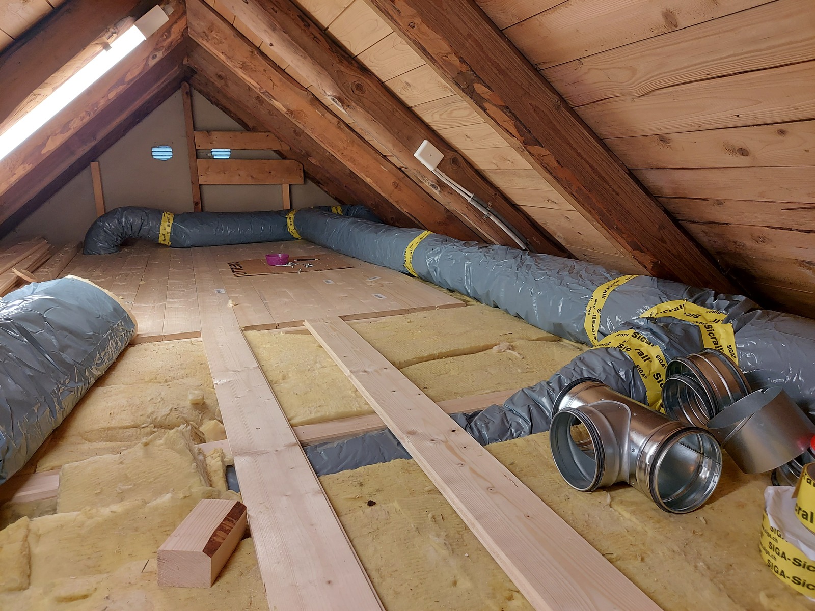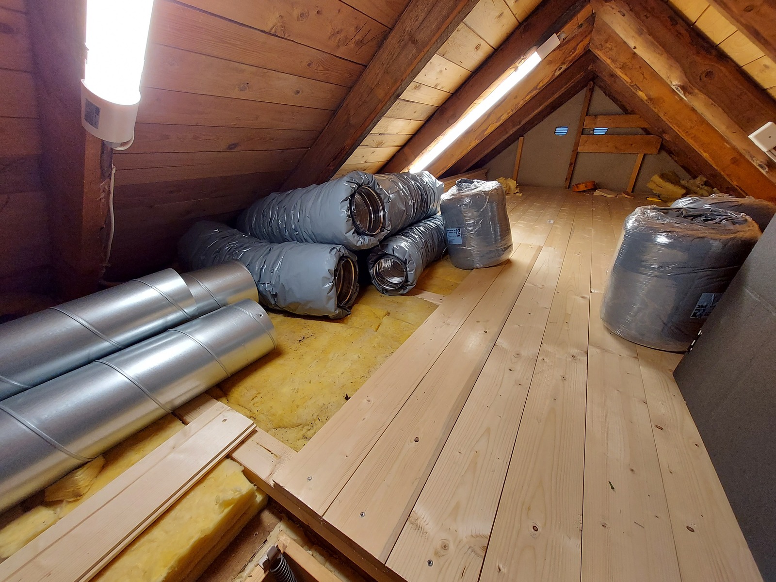 A lot of spiral ducts and ducting accessories, like noise traps, were carried up to the attic.