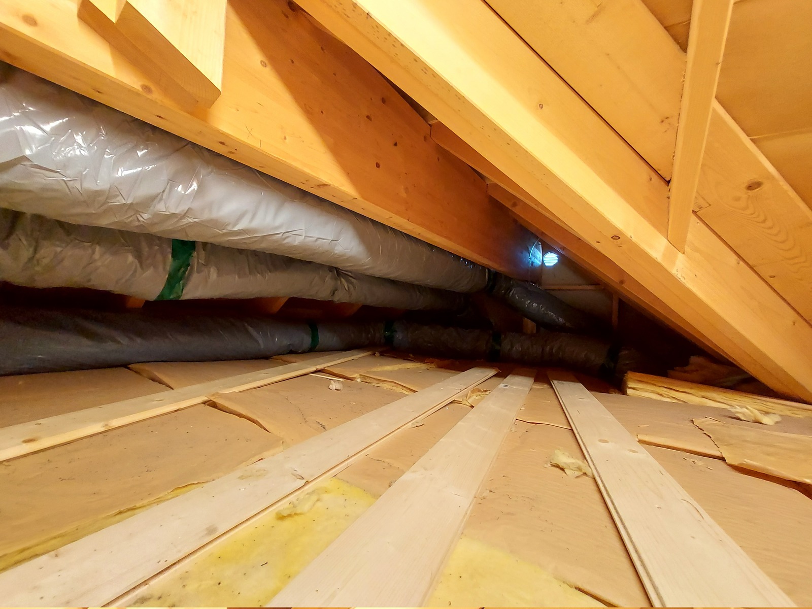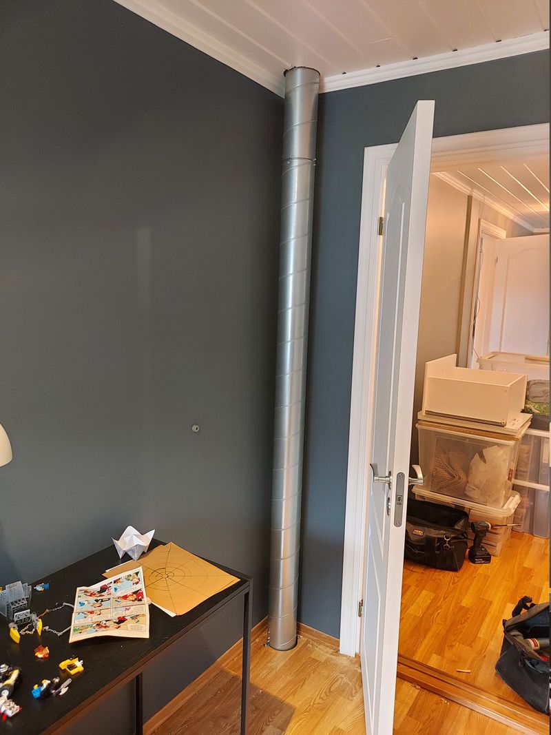 The most exciting/challenging duct; is the one going through the 2nd floor, and into the 1st floor living room. Here seen from below, all the way up to the attic 🙂