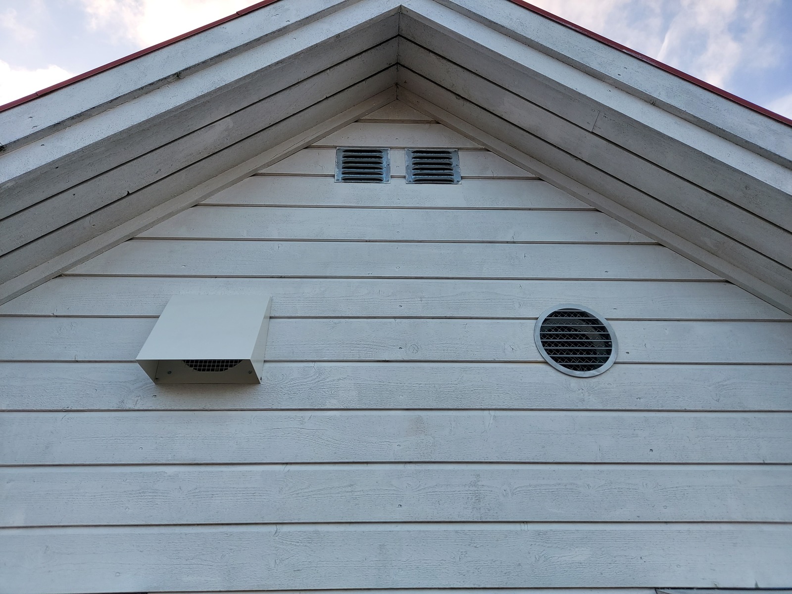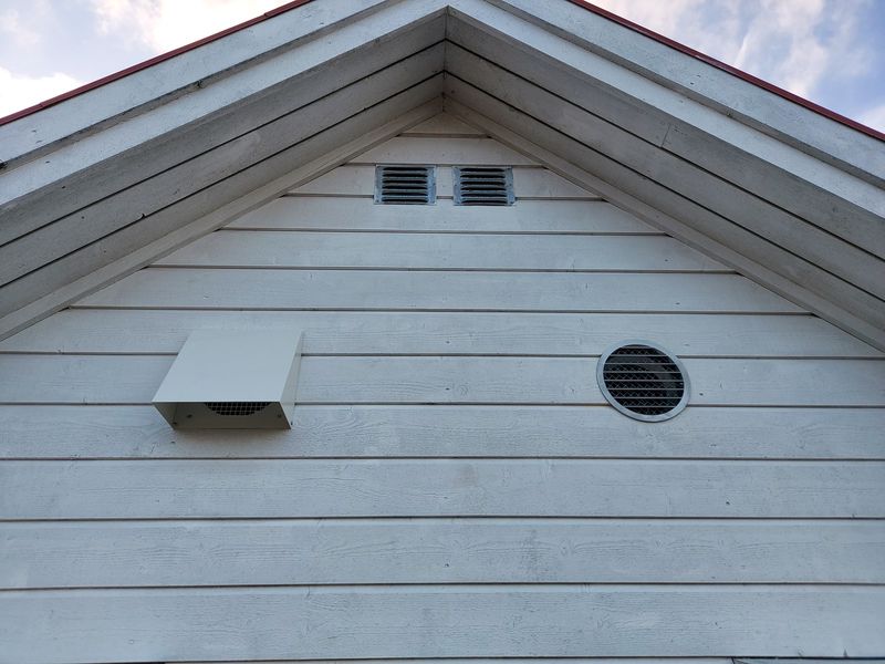 Two 160 mm holes were cut in the east facing gable wall, for the outside exhaust and supply air. The east wall is typically used because it’s in the shade most of the day.