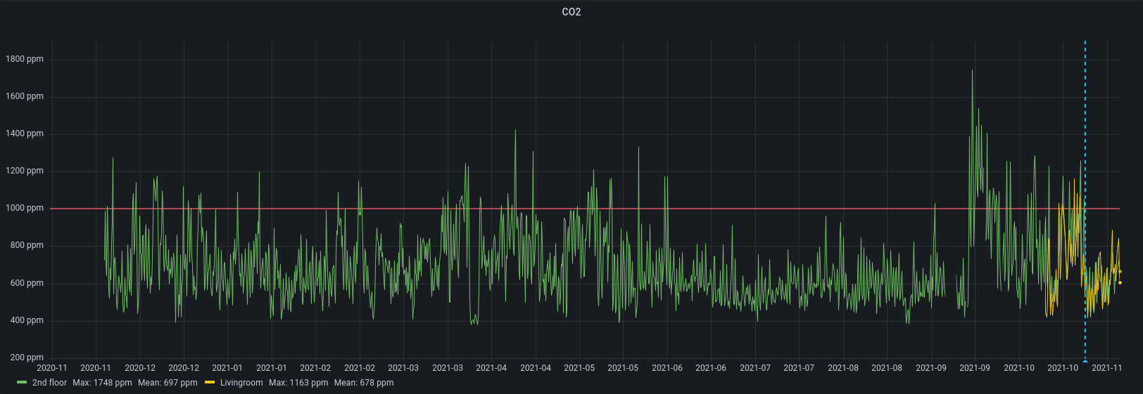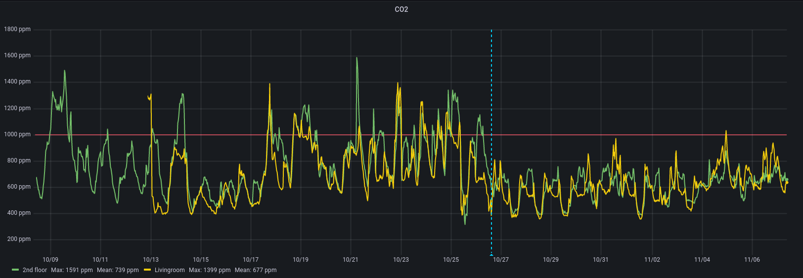 Looking at the CO₂ levels for the last 30 days, with the start of the ventilation marked with the blue dotted line, it’s quite clear that it has a big impact on the air quality on both floors.