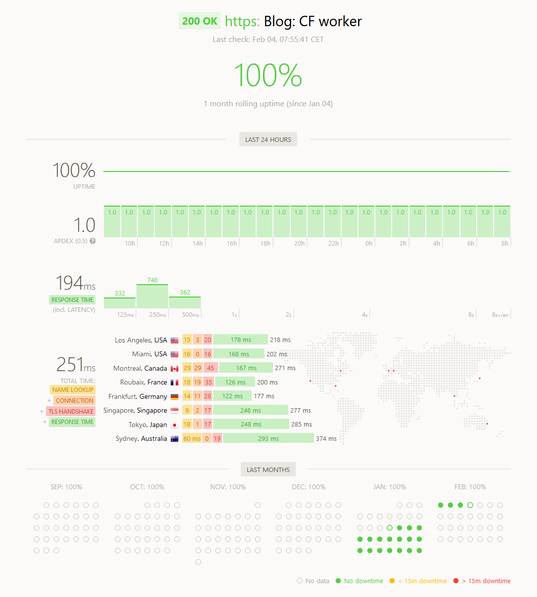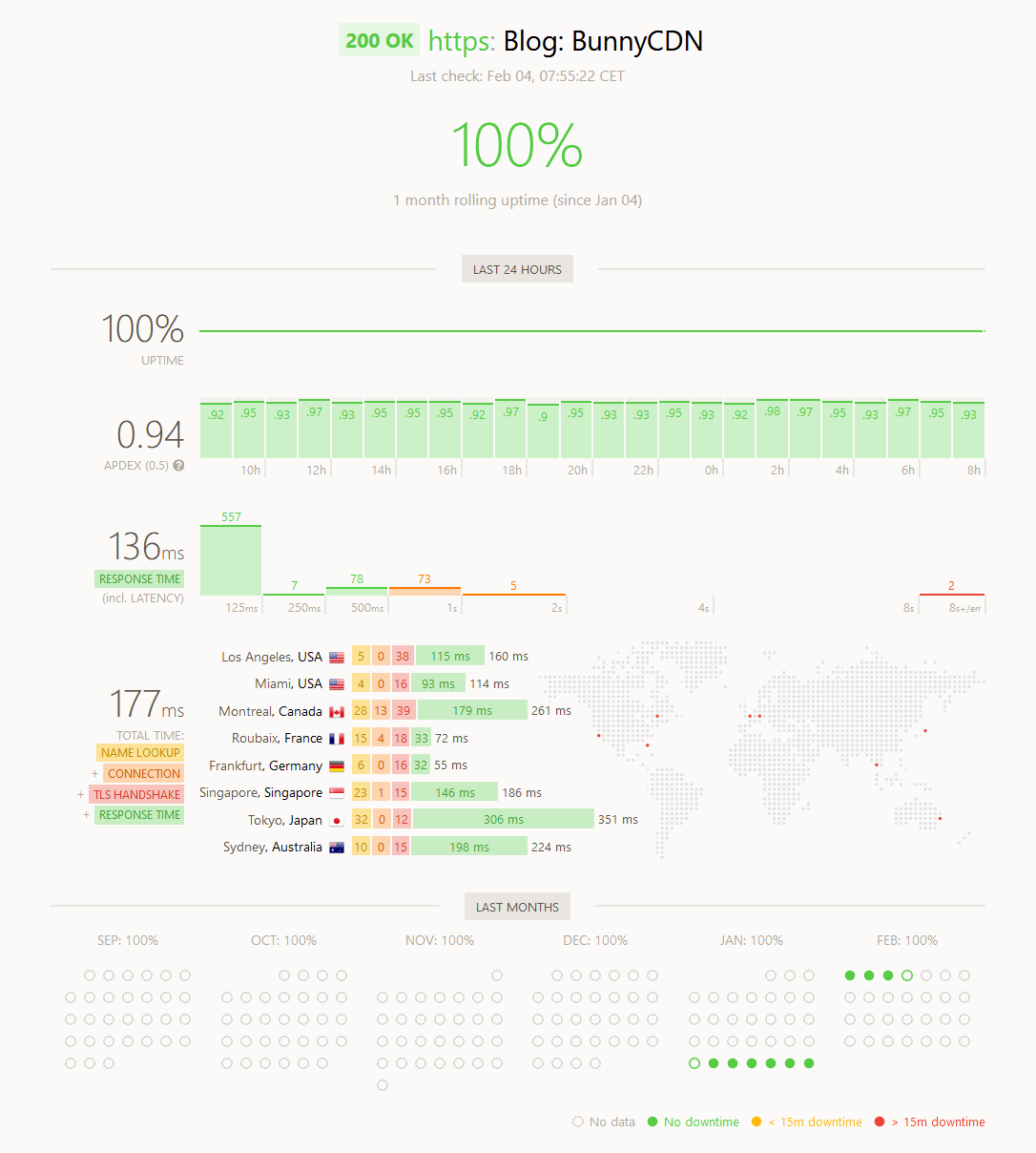 Then I tried putting BunnyCDN, or Bunny.net as they are called now, in front of the VPS. That reduced the response times considerably. I did notice some slow-downs which I couldn’t explain, with the site taking over one second to load.
