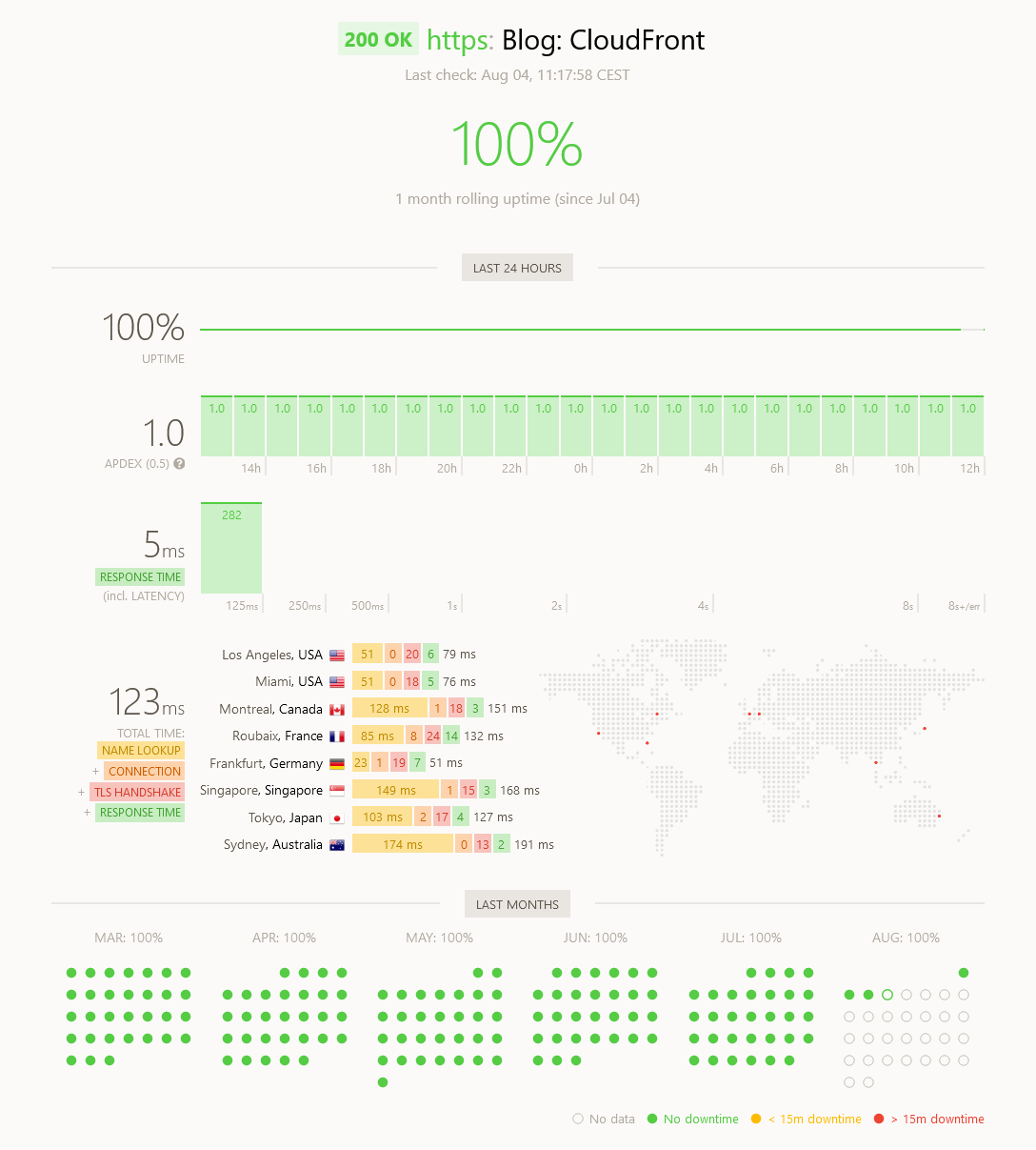 Lastly it’s S3 and CloudFront, where I am hosting the site today. And as you can see below; the performance is consistently good. With a server response time below 10 ms. The slowest part is the Route53 name lookup ¯\_(ツ)_/¯