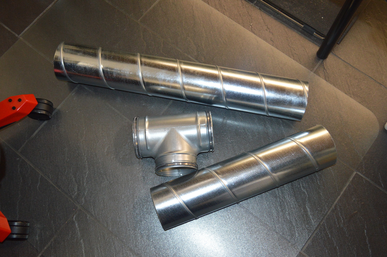 I wanted the new exhaust system to be dual purpose; remove hot air from the homelab and solder fumes from the electronics lab. So I got a T-branch and spiral tubes which I cut into suitable lengths.