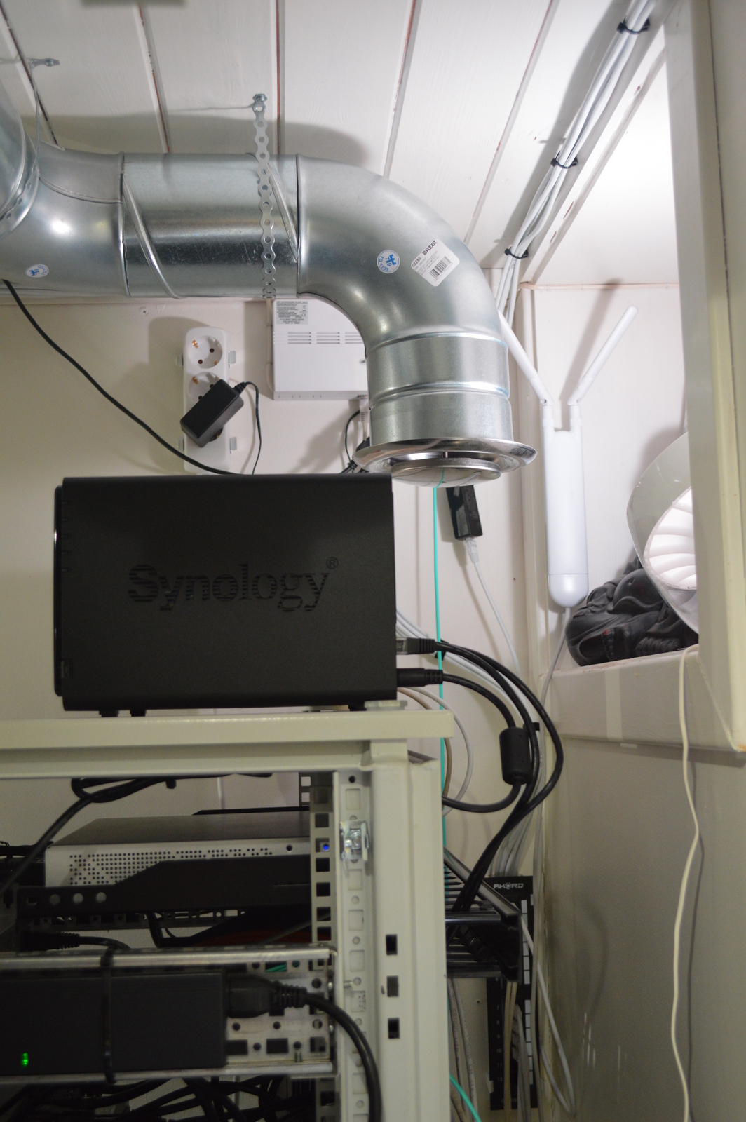So this is how it turned out. I’m not sure how efficient the intake over the homelab is… It might be that the hot air pushed towards the wall behind the rack will spread in all direction and not really “rise” up like I imagined it would. Furthermore, I don’t have any convenient way of adjusting the airflow on the two intakes. I can rotate the disk on the intake, but it’s a bit annoying, might have to work out something better eventually.