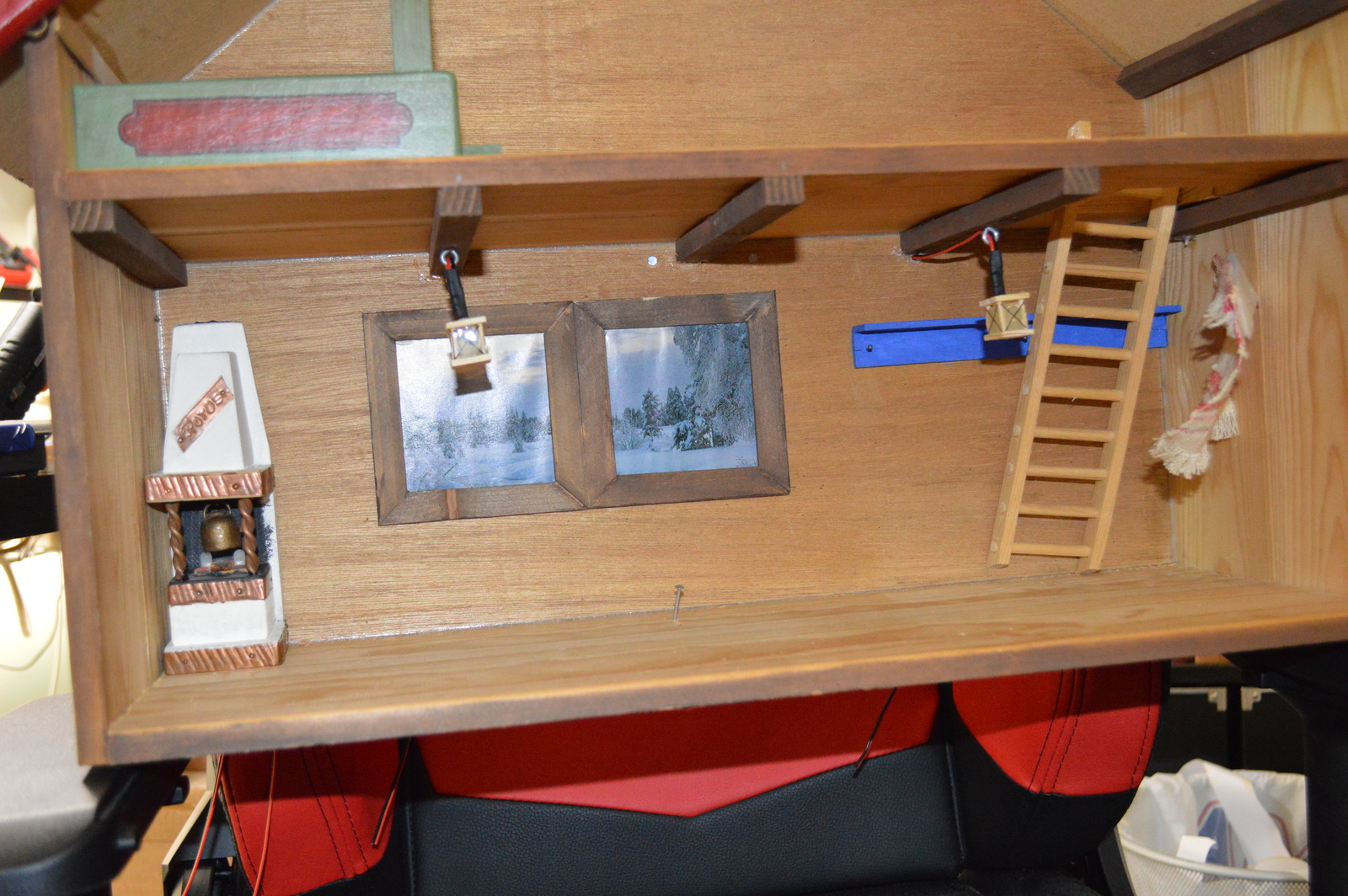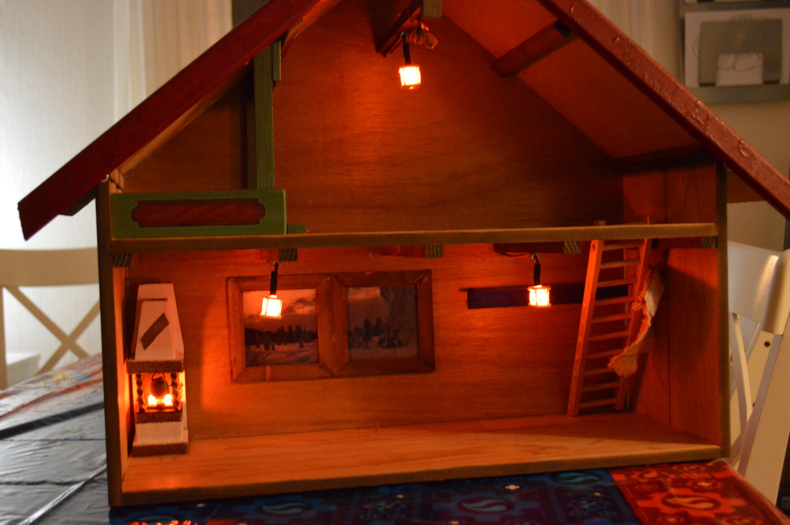 Mom wanted the fireplace to look alive, and to have some lights on both floors. My initial idea was to use a warm white LED strip and turn the brightness way down to light the two floors, but I felt the atmosphere was lost. They are elves; they don’t have fluorescent lighting. So I ended up using the orange flickering LEDs in both the fireplace and some miniature lanterns.