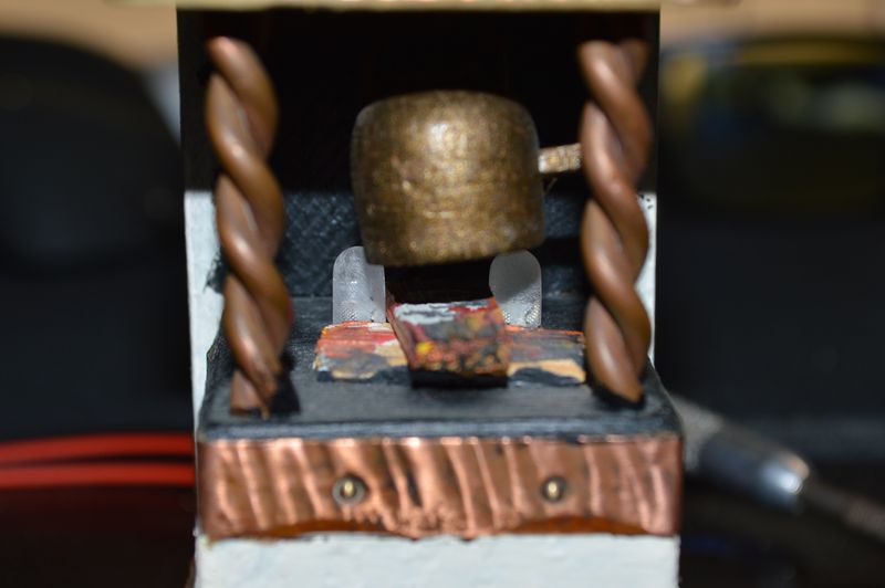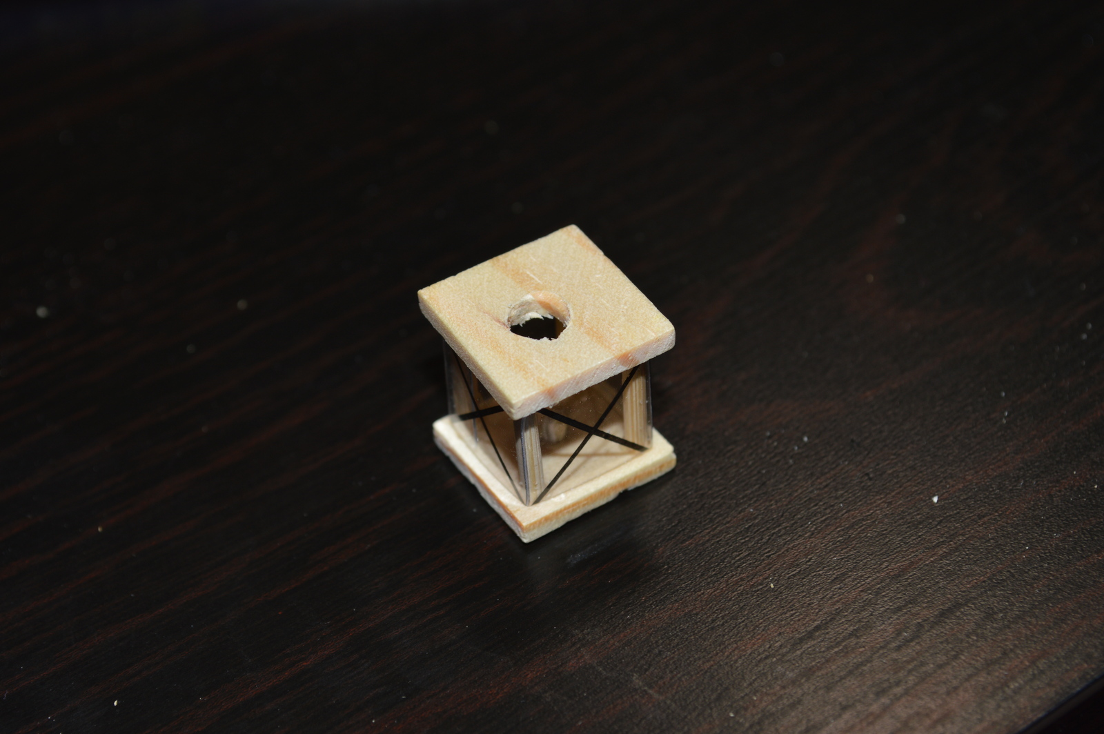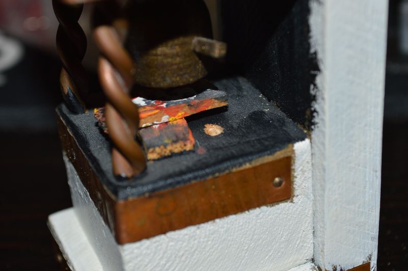 I drilled two holes from the underside of the fireplace, trying to exit right next to the logs. The flickering LEDs were clear and had a pretty focused light beam, so I sanded them down to make them diffuse. Then I threaded the wires through from the top, so the LEDs sits above the holes. That turned out pretty good and was a lot easier than trying to insert them from below. The wires go out the bottom of the fireplace and back of the miniature house, so they are entirely invisible. I had to mount the resistors for the LEDs on the backside of the house, as there was no room for them in the fireplace.