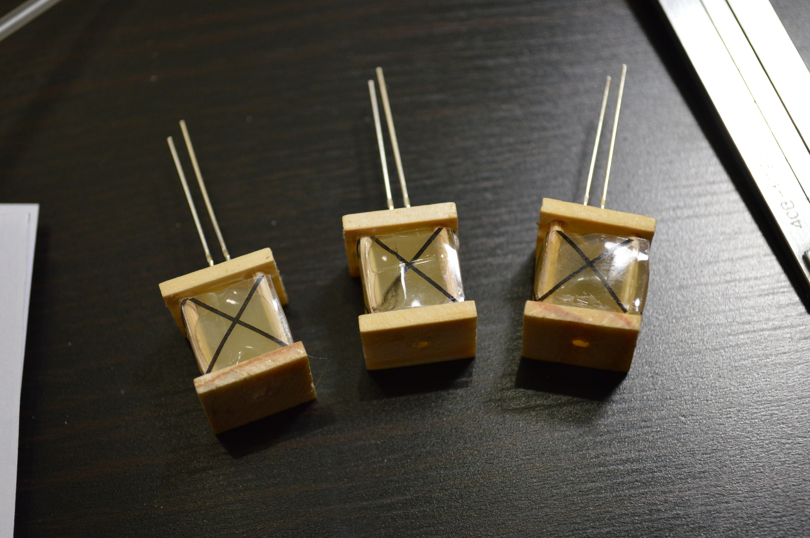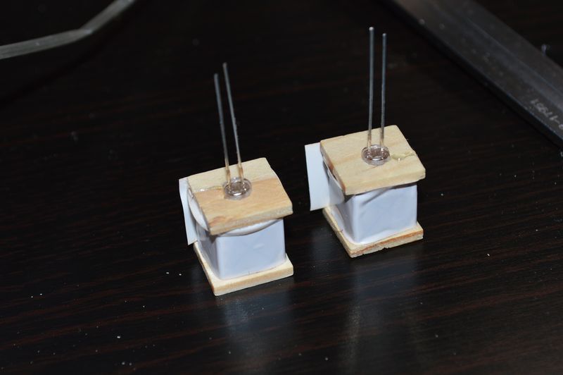 That worked very well, the LEDs was fastened, and the hot glue gave it a nice diffuse look, so it looks like the whole lantern is lighting up and hides the LED. I soldered a resistor and very soft wires to the LEDs and suspended them from the ceiling using screw eyes. The hot glue also gave the lanterns some weight, so they actually hung down from the wires, and looked somewhat authentic.