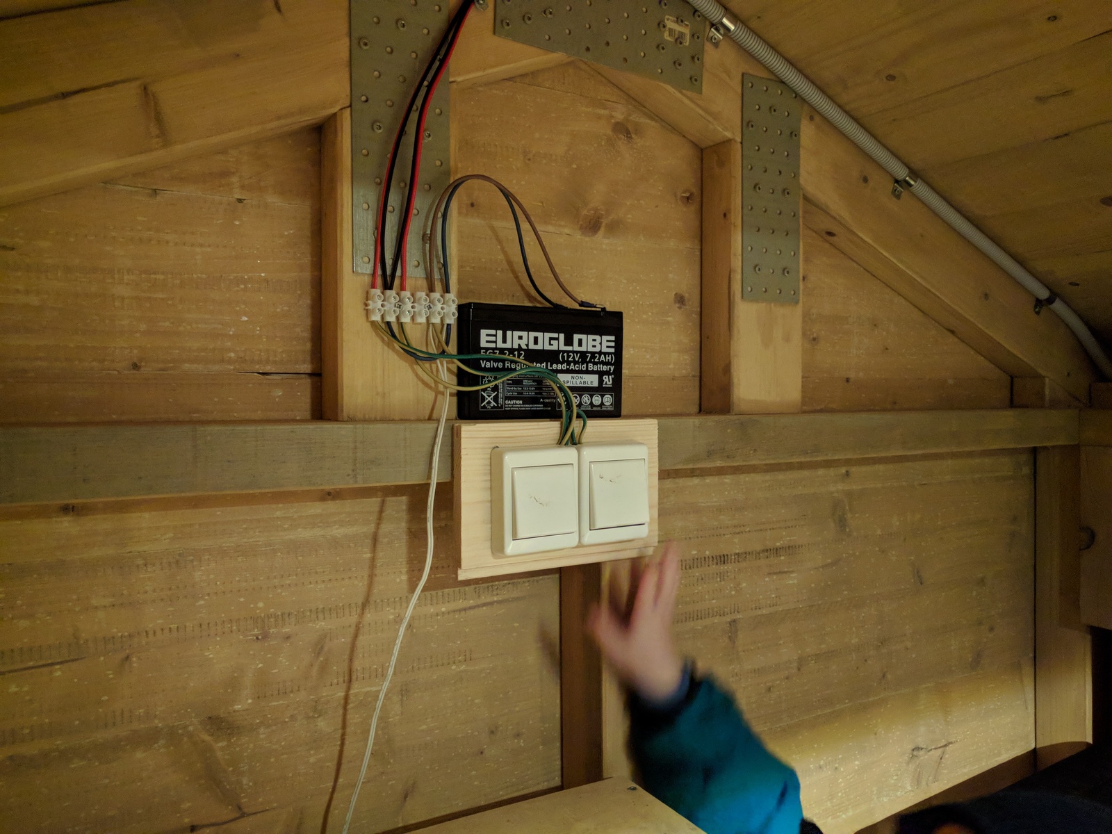 The two lights are controlled with regular wall-mounted mains switches, this makes them easy to operate — even for tiny hands inside mittens.