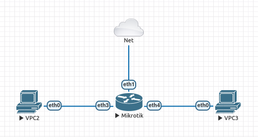 Then I added two virtual PCs, and connected them to eth3 and eth4. Now I just need to create IP addresses on those interfaces and maybe a DHCP server, then I should be able to confirm that they can reach each other.