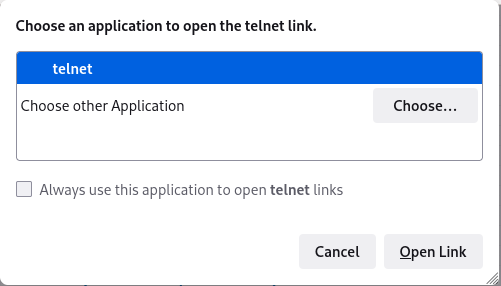 I wasn’t able to click the nodes, as Firefox didn’t know what to do with the telnet:// links… Let’s fix that.