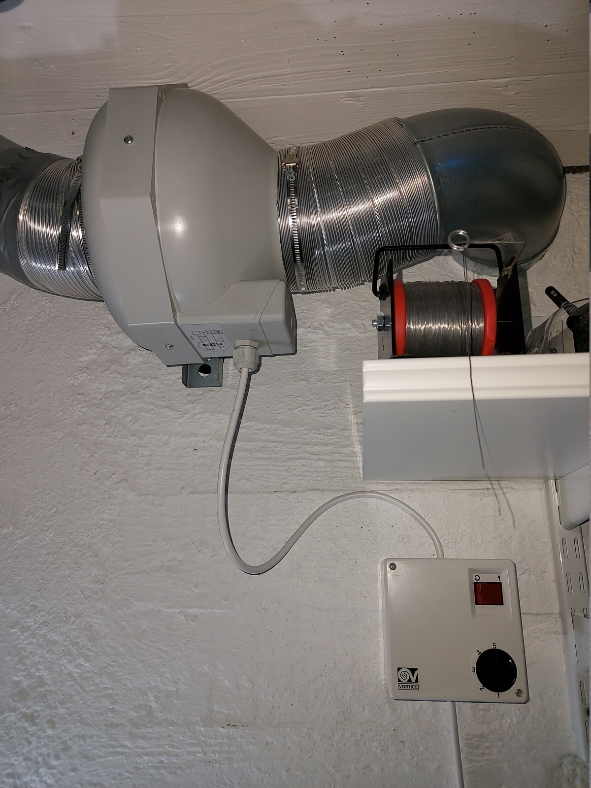 The fan is a backward centrifugal extractor (RK 125L), capable of moving 168 m³/hour (99 ft³/min). I have a speed controller for the fan, but I mostly run it at full speed.