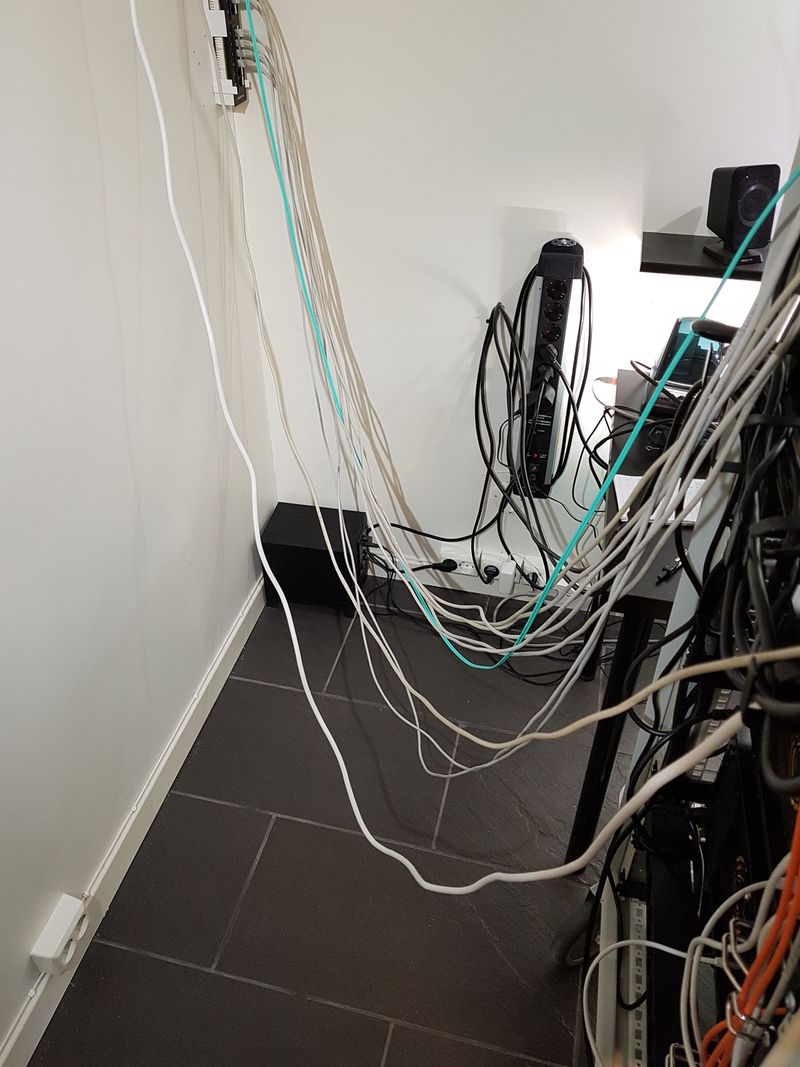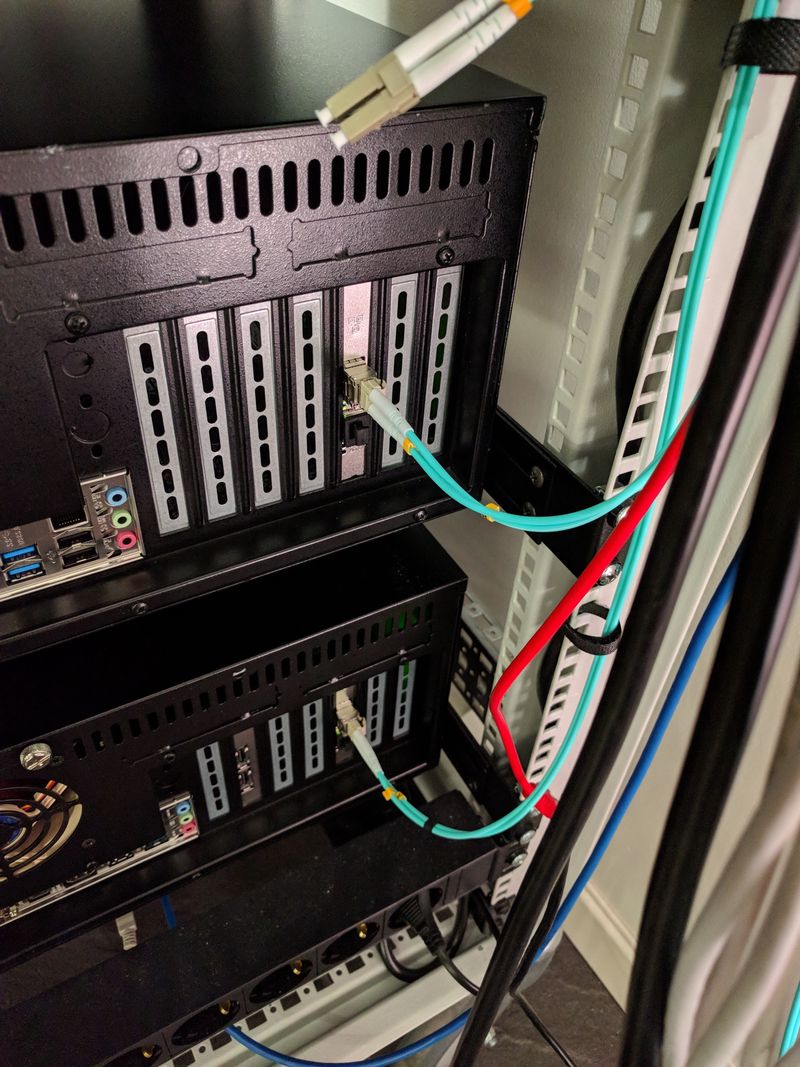 I’ve got a 500/500 fiber internet that comes into the home office and goes through a media converter on the wall above the rack. From there, an Ethernet cable goes to the Edgerouter and to the Unifi 16XG switch, which is the backbone of my home network. All computers in the rack are connected to the network with 10 Gbit multi-mode fiber.