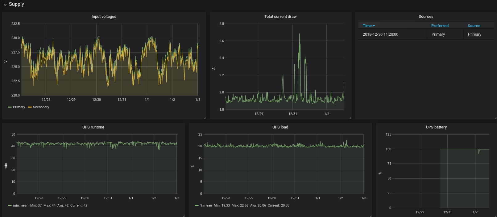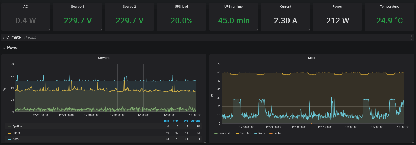 Collected metrics like load, running time, voltage, current, power, and temperatures are read and published as MQTT topics; which Home Assistant subscribes to. The values are also stored in InfluxDB, where they can be read by Grafana to create graphs and cool looking dashboards.