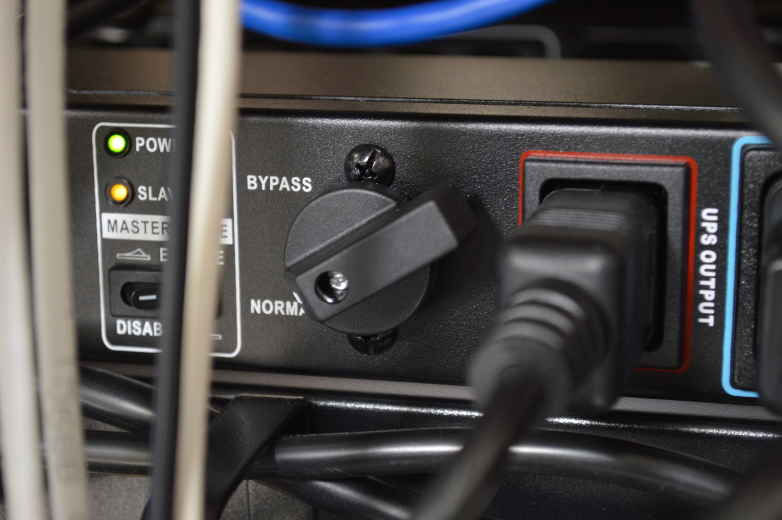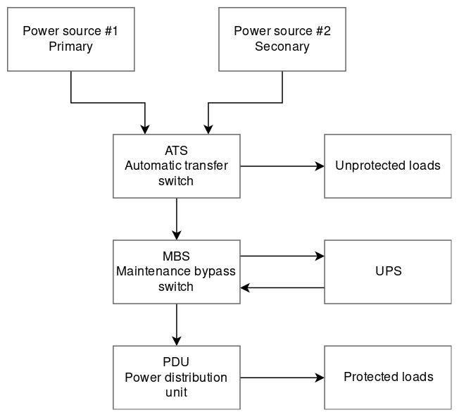 The ATS powers the UPS through a maintenance bypass switch (MBS); this allows me to bypass the UPS for maintenance or testing, without turning off any of the connected devices. When the MBS is in bypass mode, the system is without UPS protection.