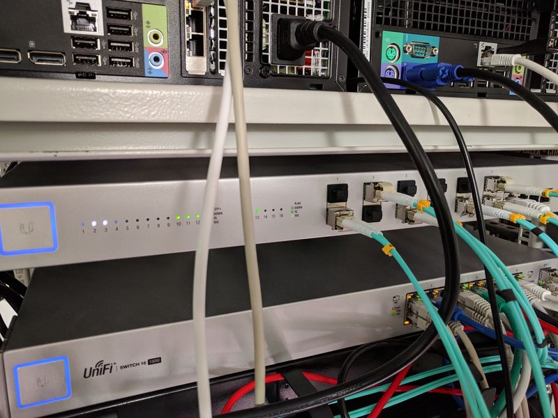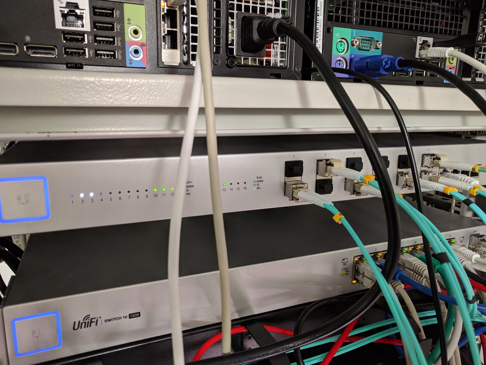 In addition to the UniFi 16XG, I also have a Unifi 16 POE-150W switch, used for Gbit and PoE devices, such as Raspberry Pies and WiFi access points. Between the two switches in the rack are two Gbit aggregated fiber connections. On the wall behind the rack is a 12 port patch panel that connects the rest of the house to the network.