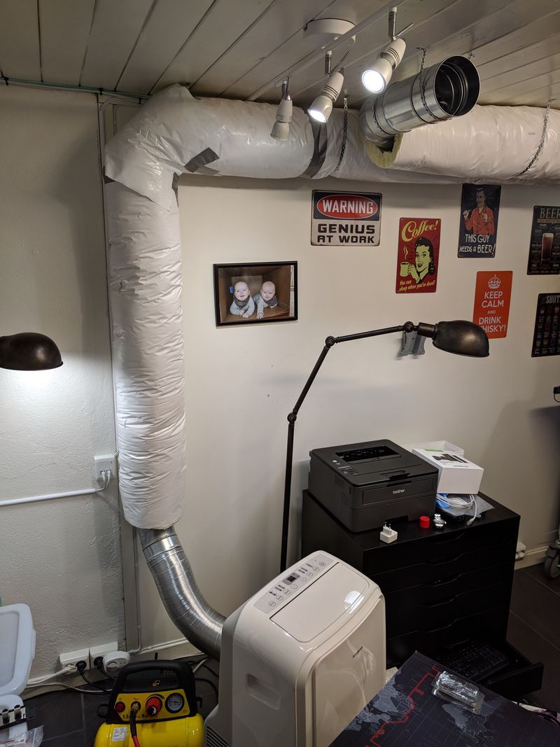 My home office is 10.5 m2 (113 ft2), in the basement and pretty well insulated. With the heat output from the homelab and nowhere for that heat to go, it could potentially get pretty hot. But with my ventilation system, that heat is either vented outside or cooled with a portable AC.