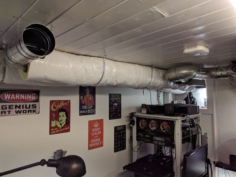 Pulls in air from two places — the ceiling above the rack, and through a fume extraction arm on the electronics lab bench. Both inlets have valves to regulate the flow of air or shut them off completely. The fume extraction on the desk is only open when I solder or do other things that make nasty fumes.