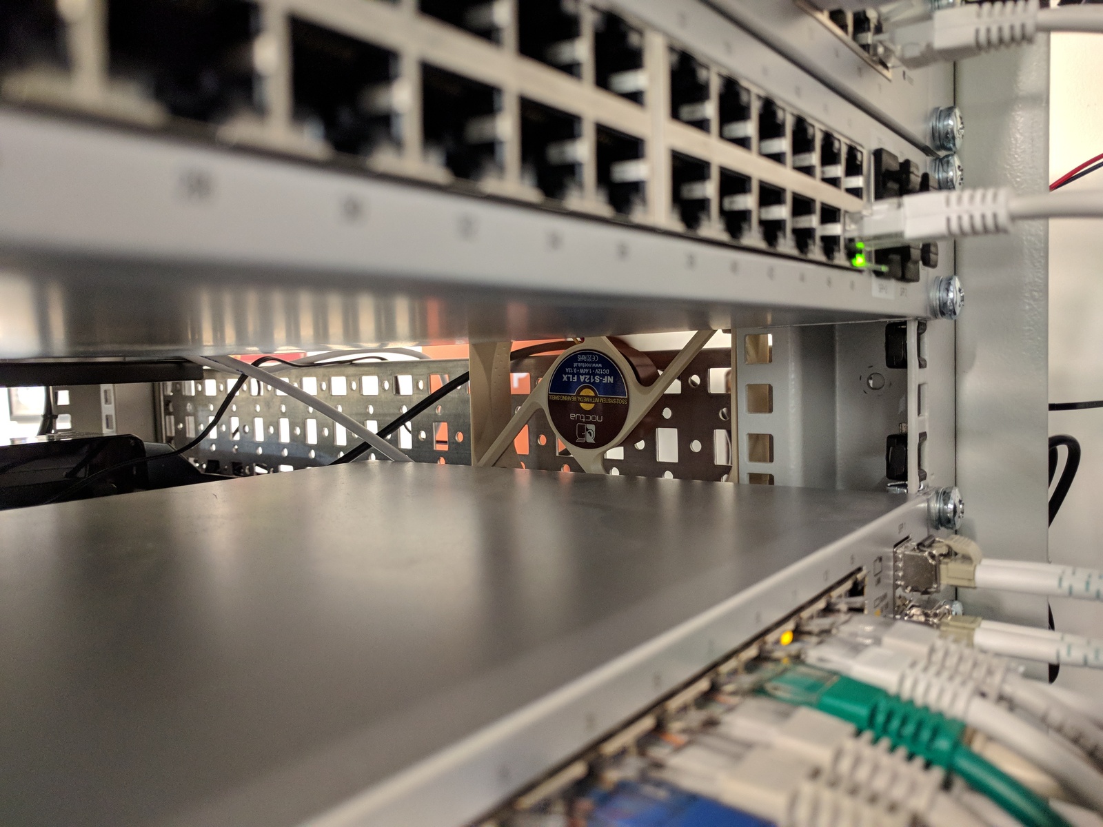I have also mounted a 120mm Noctua fan next to my UniFi US-48 and US‑16‑150W switches, this pushes air through their cases — lowering their temperature enough that their internal fans never turns on. On the 16XG, which doesn’t have temperature controlled fans, I mounted a resistor in series to lower the RPM and noise.