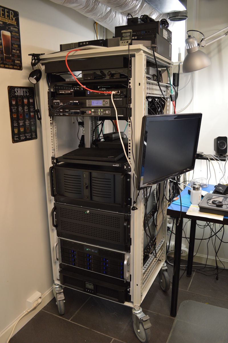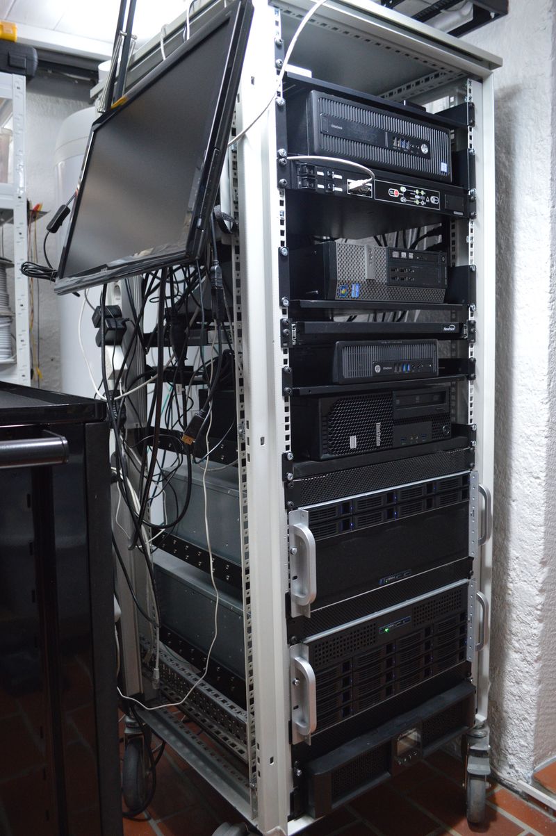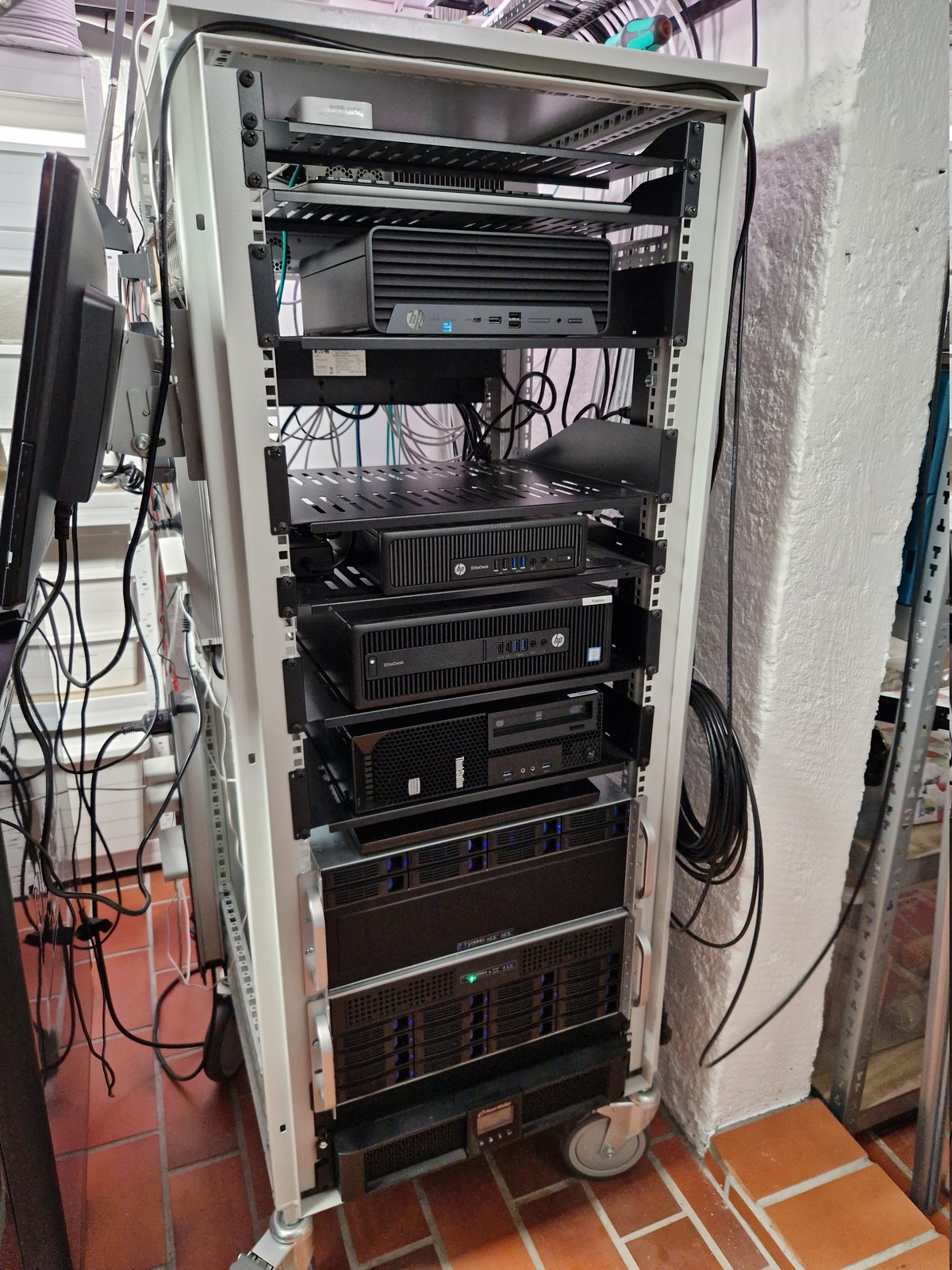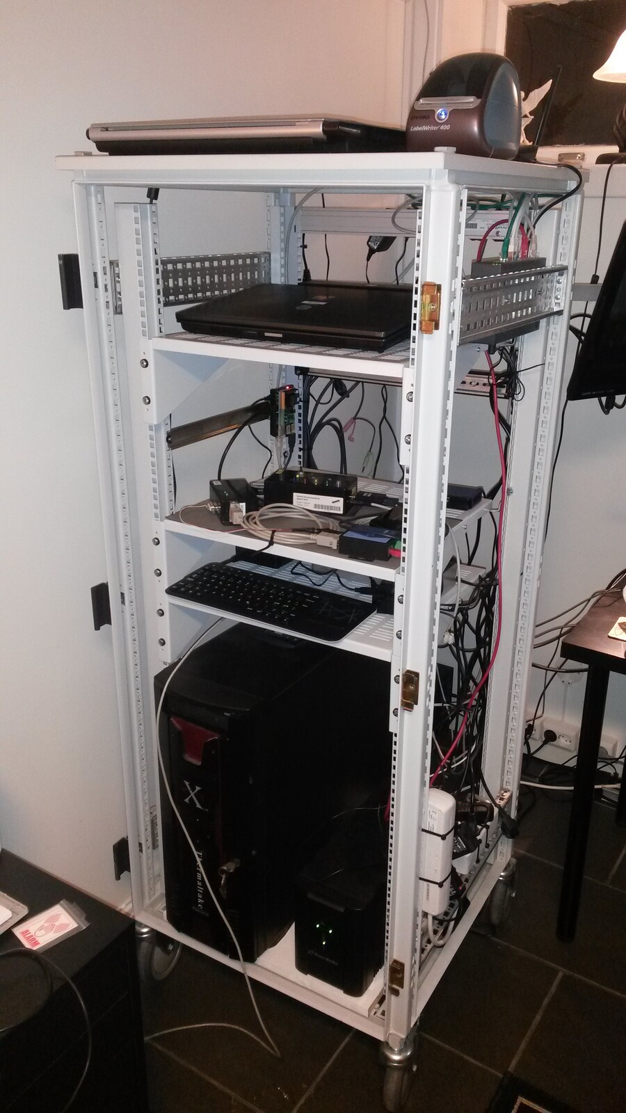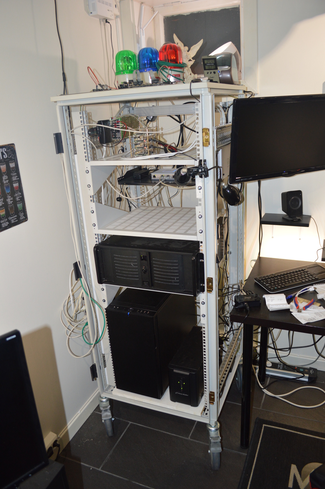 In 2010 I bought a house, and suddenly I had a server room. I got the rack for free from a friend, finally a proper rack — it was an old audio rack from a school. I still have, and use, this rack today (but the glass door had to go) 🙂