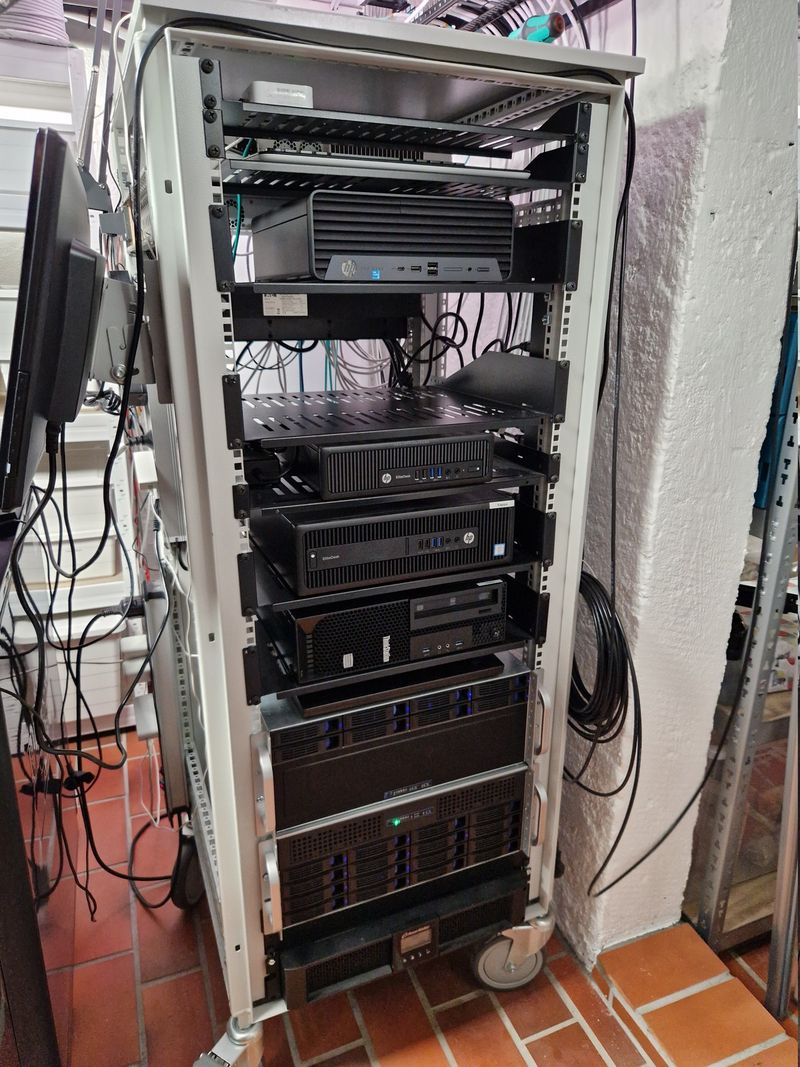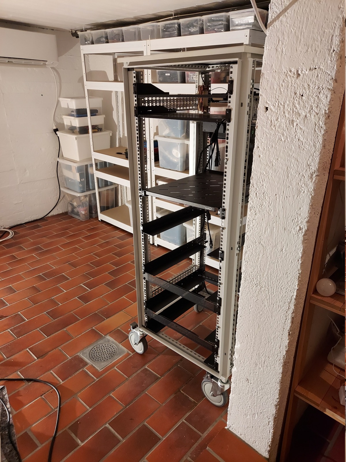 After getting the 59.5 cm wide rack through the 60 cm basement door, and down the basement stairs — it was now located in my new home office, where it still stands to this day.