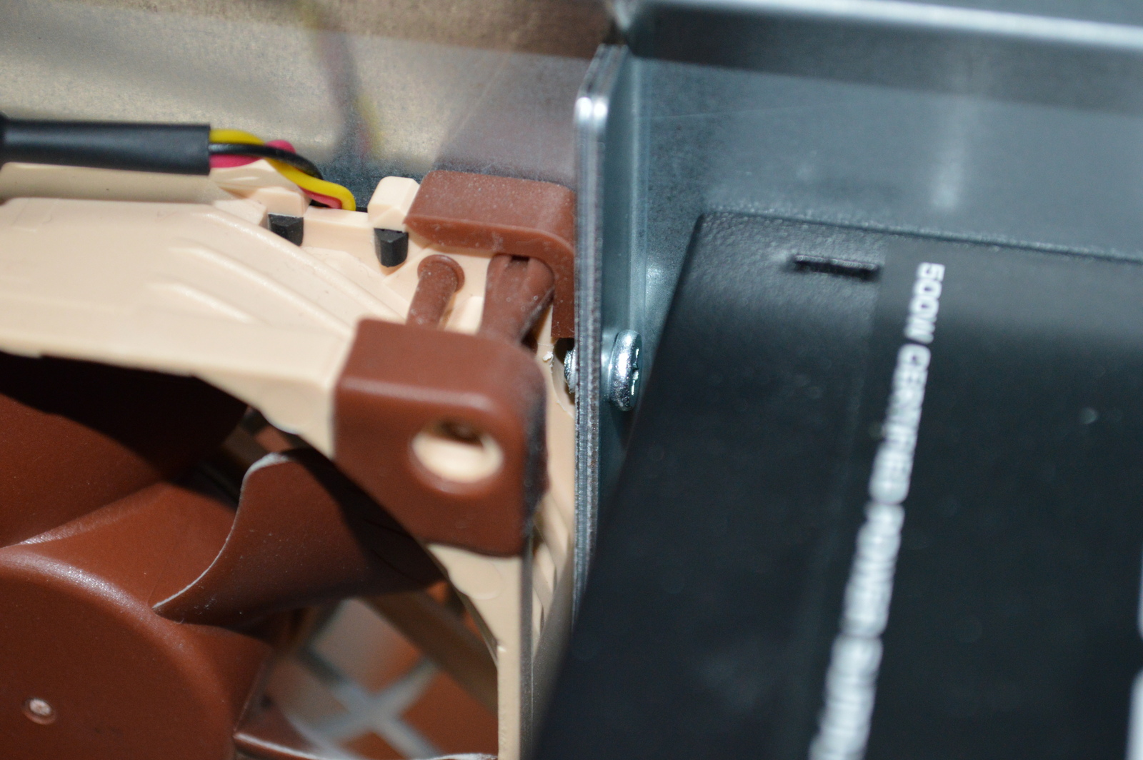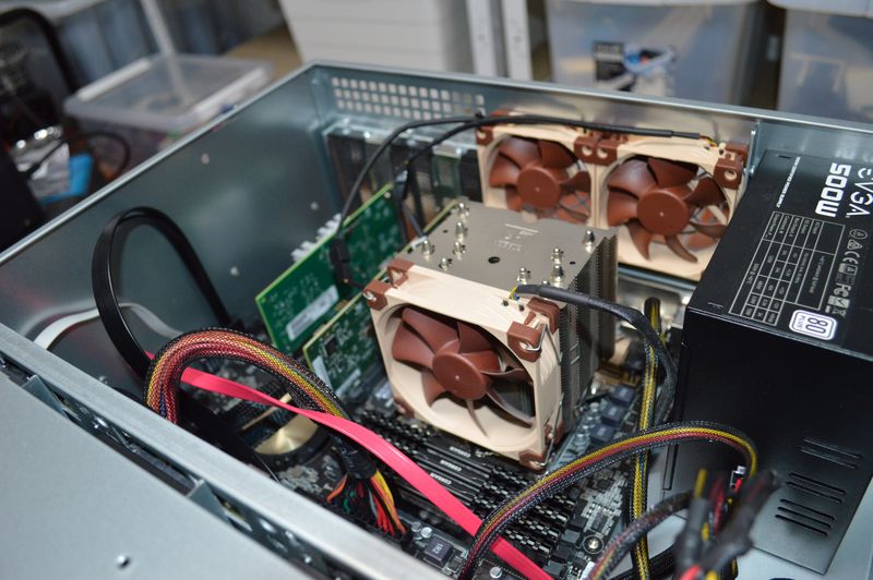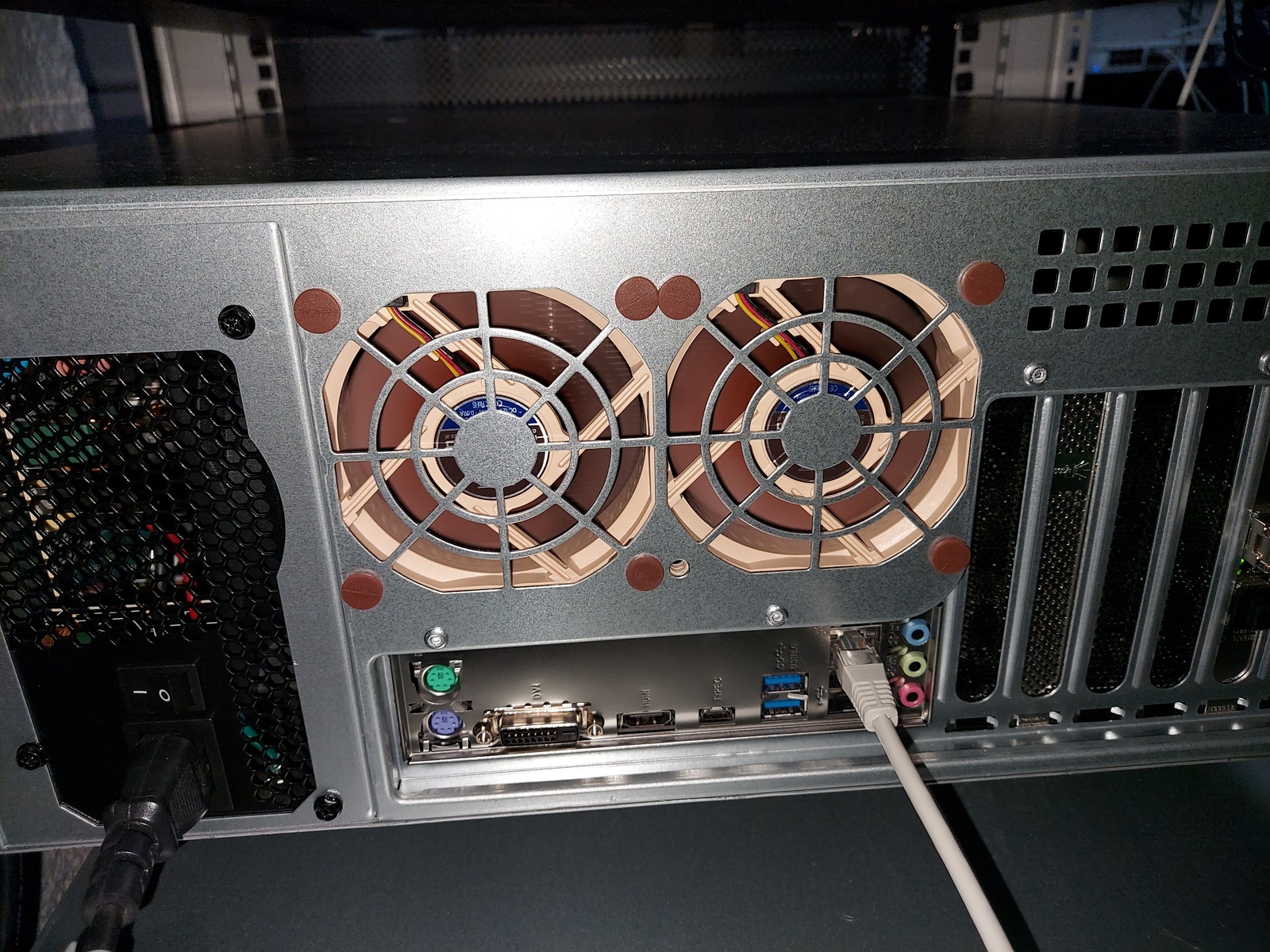 The two 80 mm Noctua fans in the back was a tight fit, I had to grind off a screw thread and make a groove in the right Noctua fan.