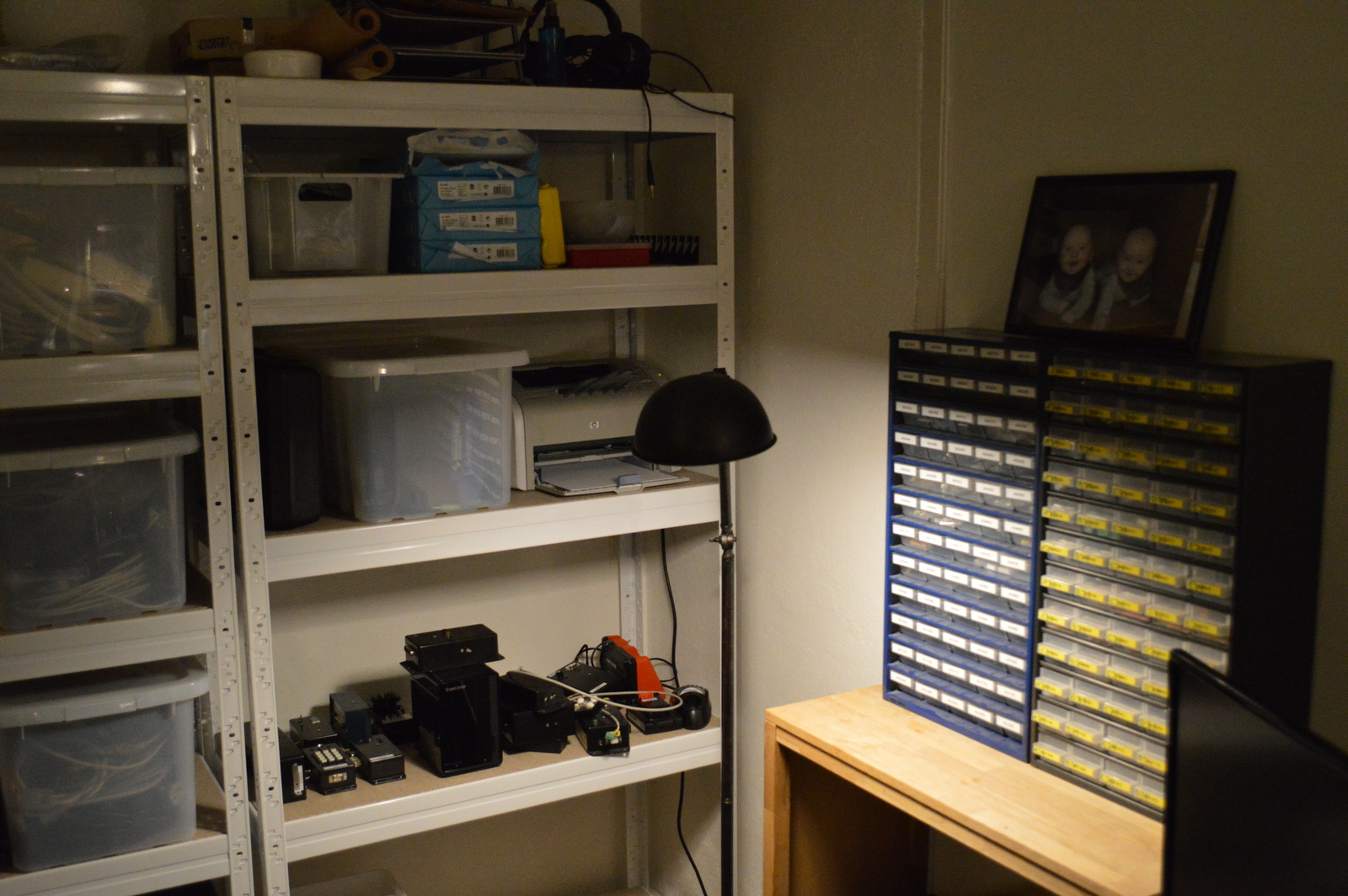 I store pretty much everything in clear boxes, making it easy to move it around, and see what is inside — my electronic components I store in small storage drawers.