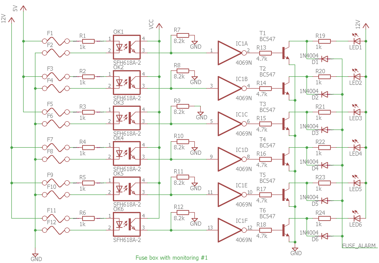Each pair of fuses powered an optocoupler, which again were connected to an inverter. So if any of the fuses broke the optocoupler would loose power, meaning that the inverter input would go LOW, and the inverter output HIGH.