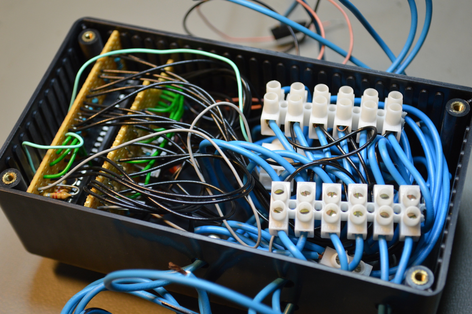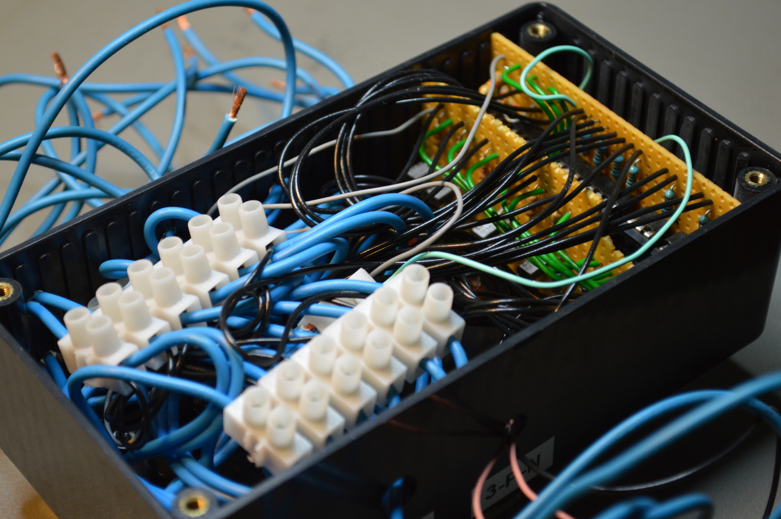 This fuse box module used to be installed in my rack box project. It had a total of 6 channels, or outputs, each with fuses on both polarities. All fuses were monitored, meaning that if a fuse broke; a failure LED would turn on and a fuse failed output activate.