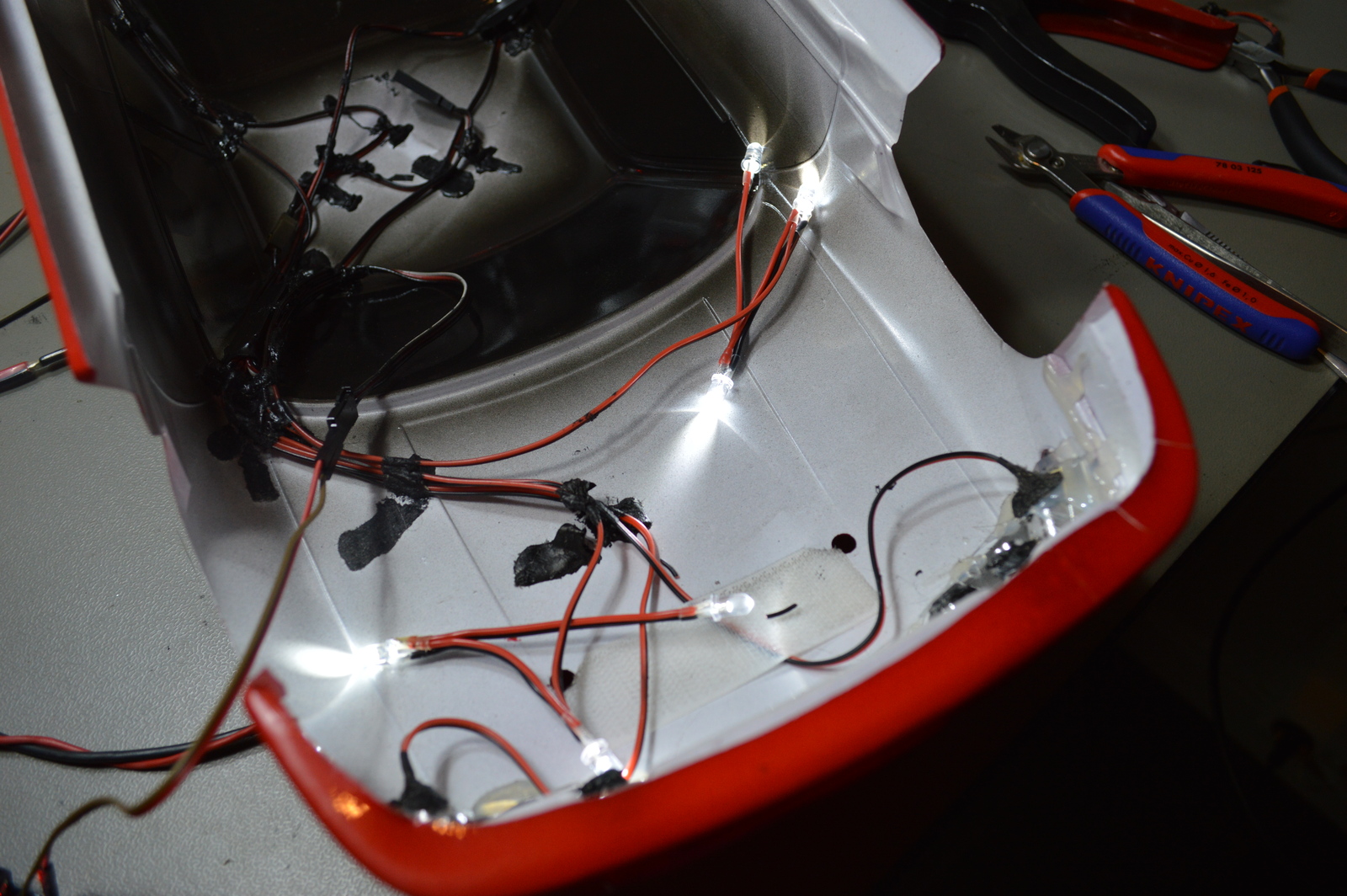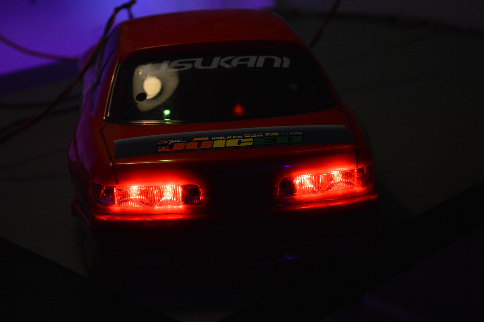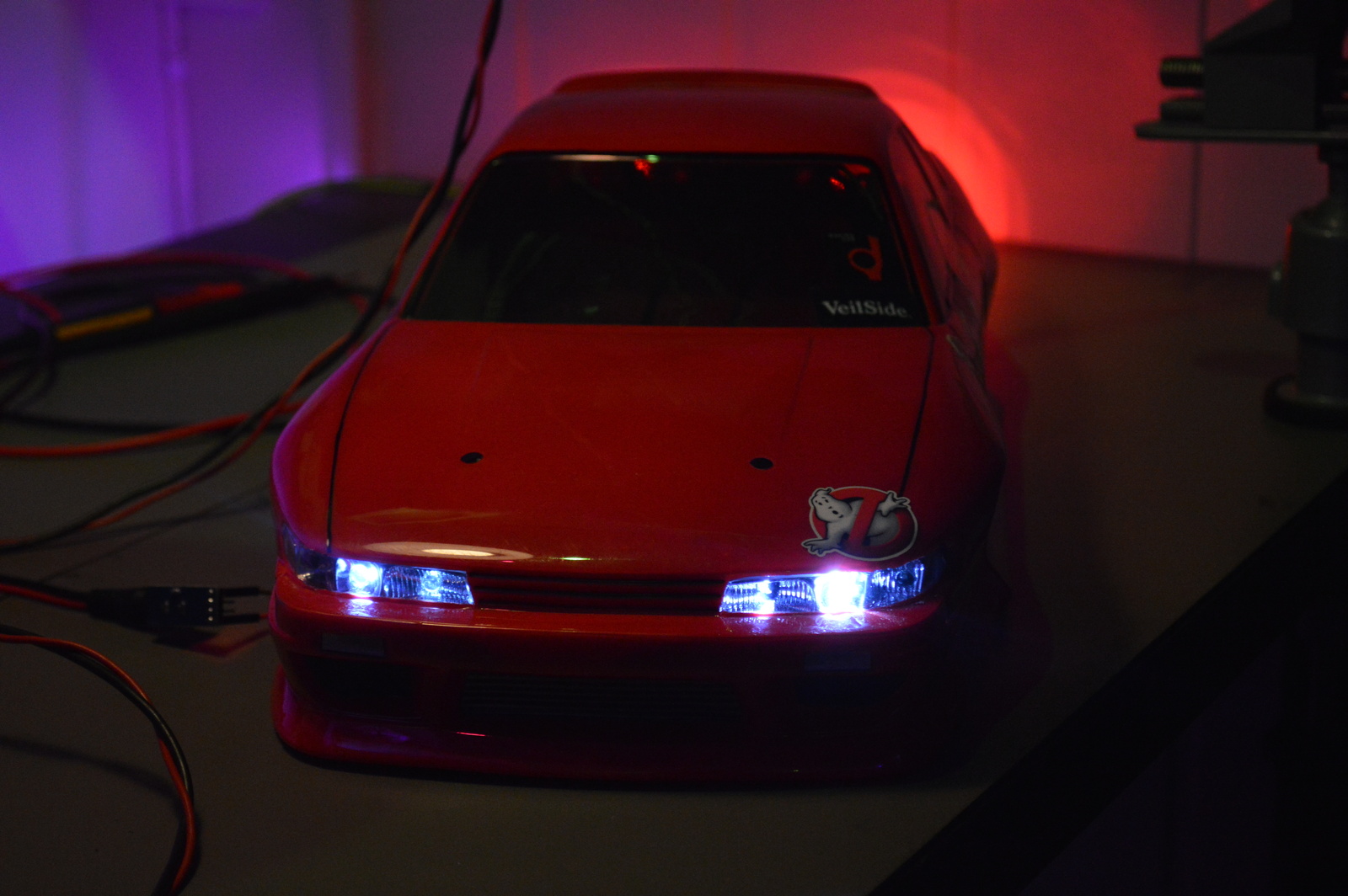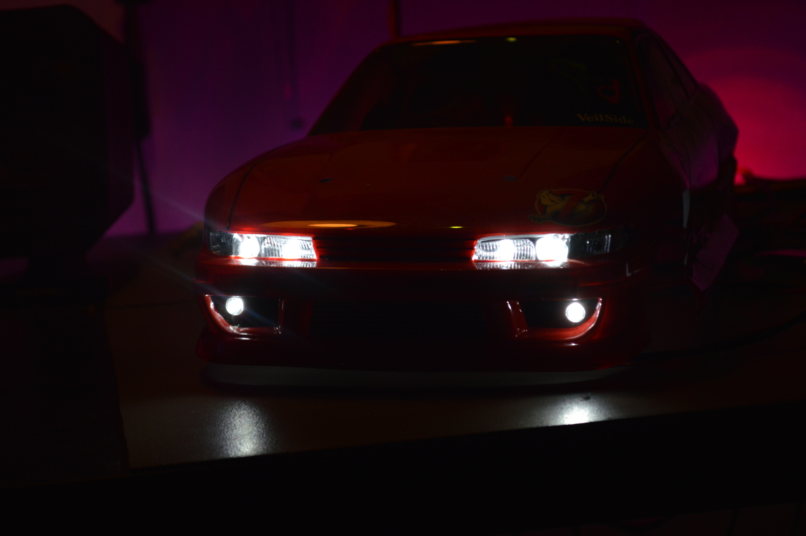 My brother-in-law is into RC car drifting, and a big part of that is of course to have a cool-looking car! He used a LED light kit, but the front lights were not that great. Very blueish and the intensity of the LEDs varied quite a bit.