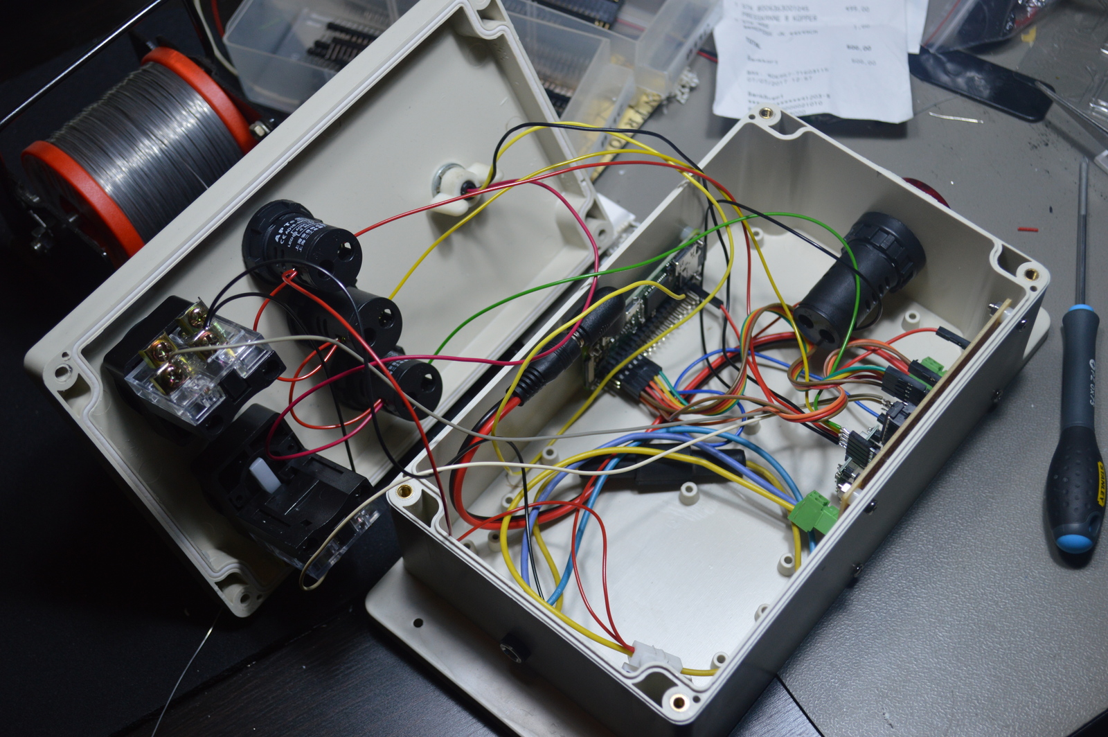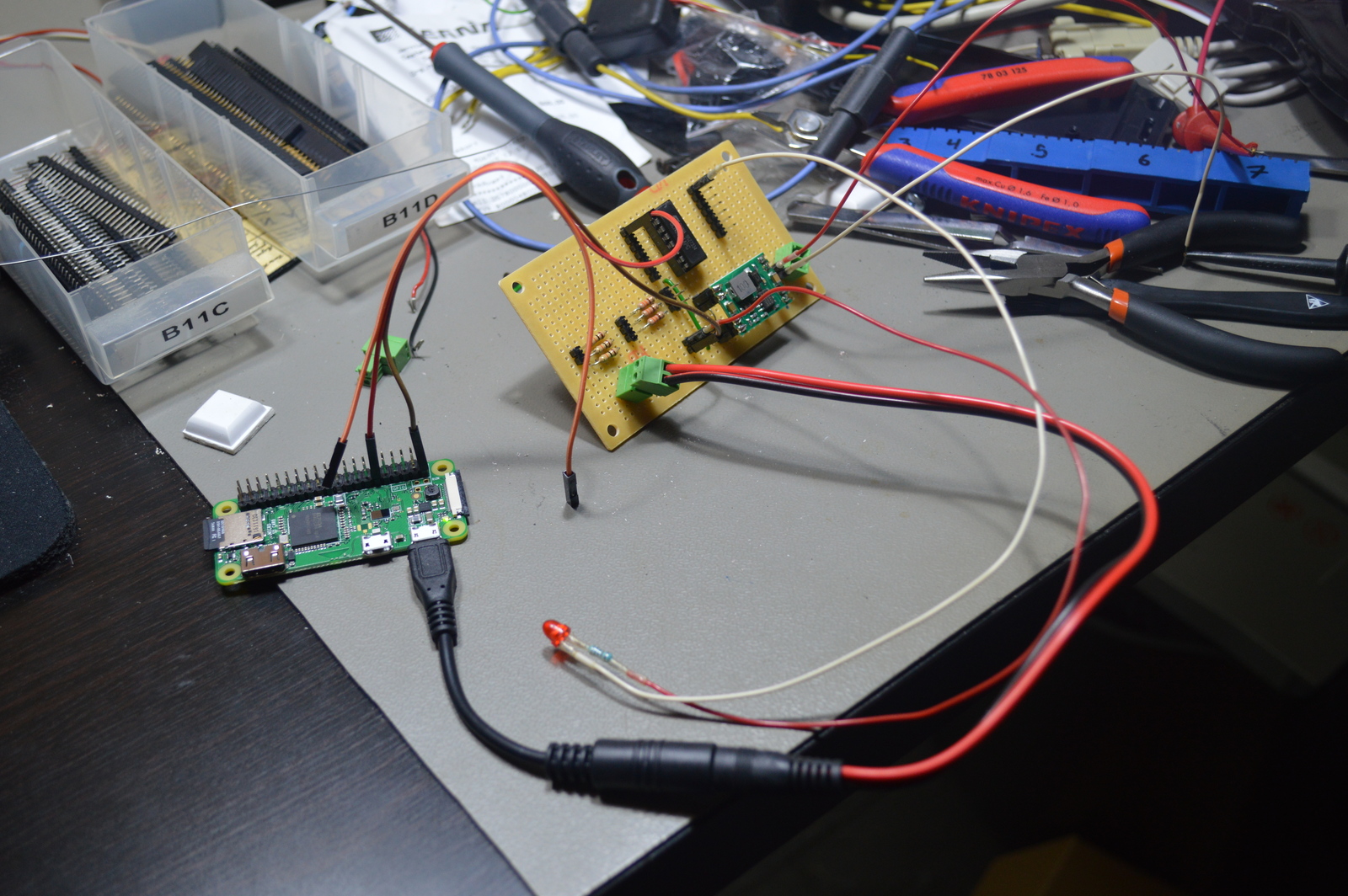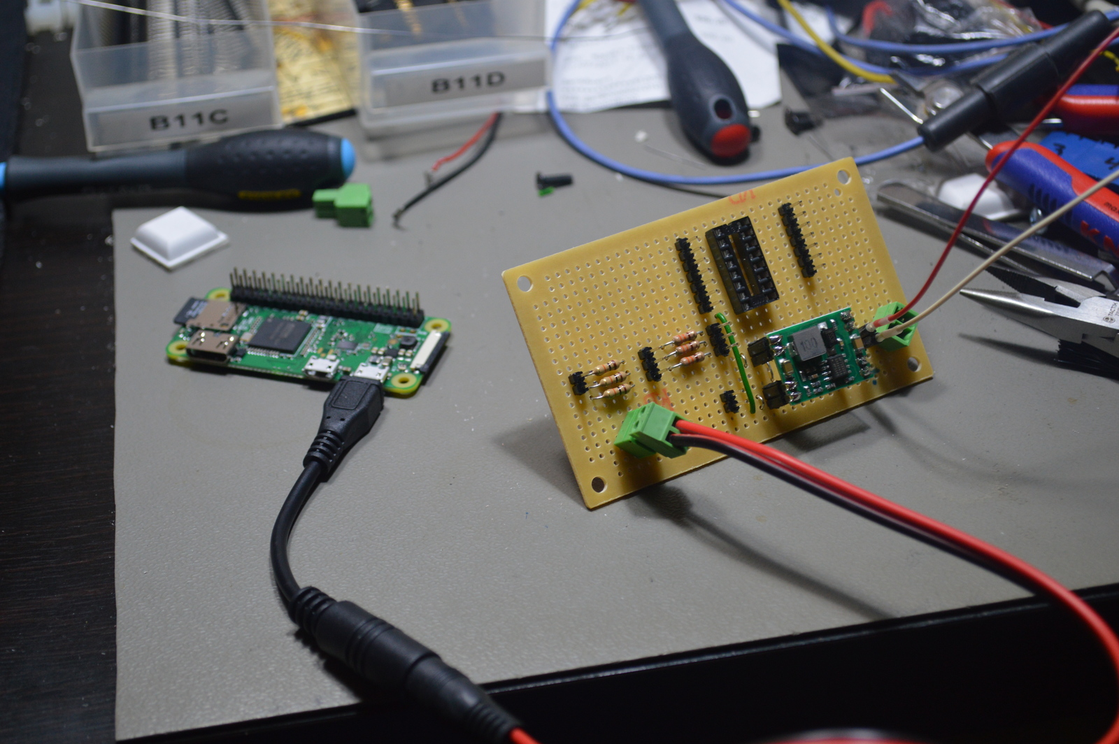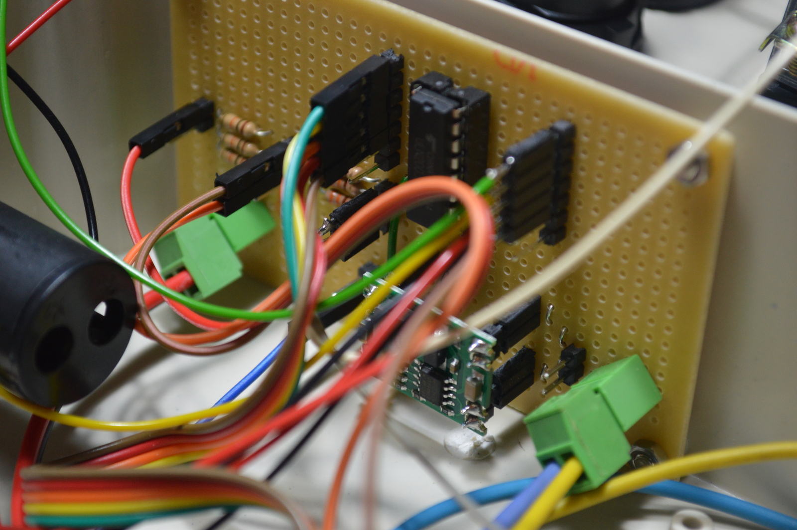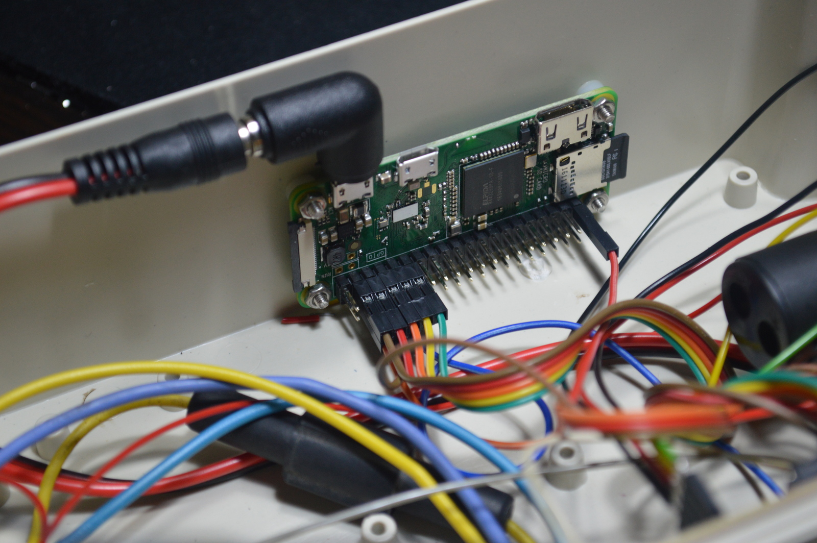 I soldered the step-down converter, Darlington driver, and input resistors to a prototype board and mounted it to the inside wall of the plastic enclosure. On the opposite side, I installed the Raspberry Pi Zero.